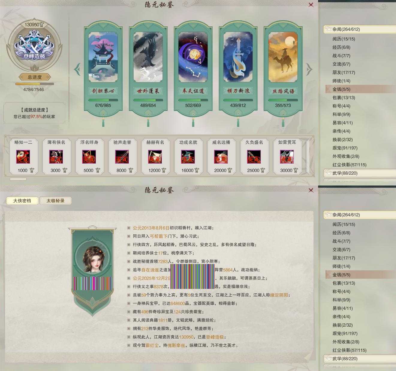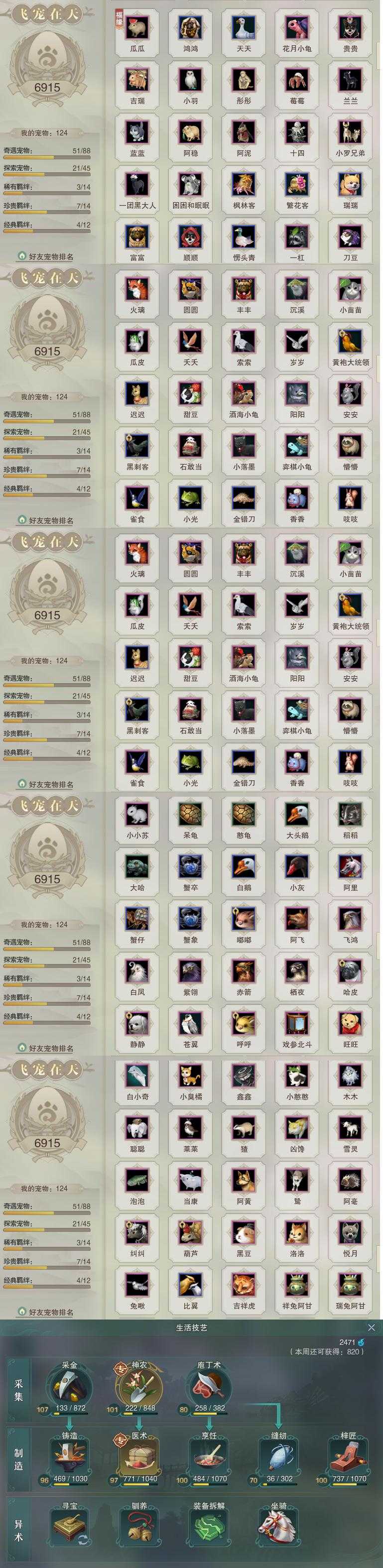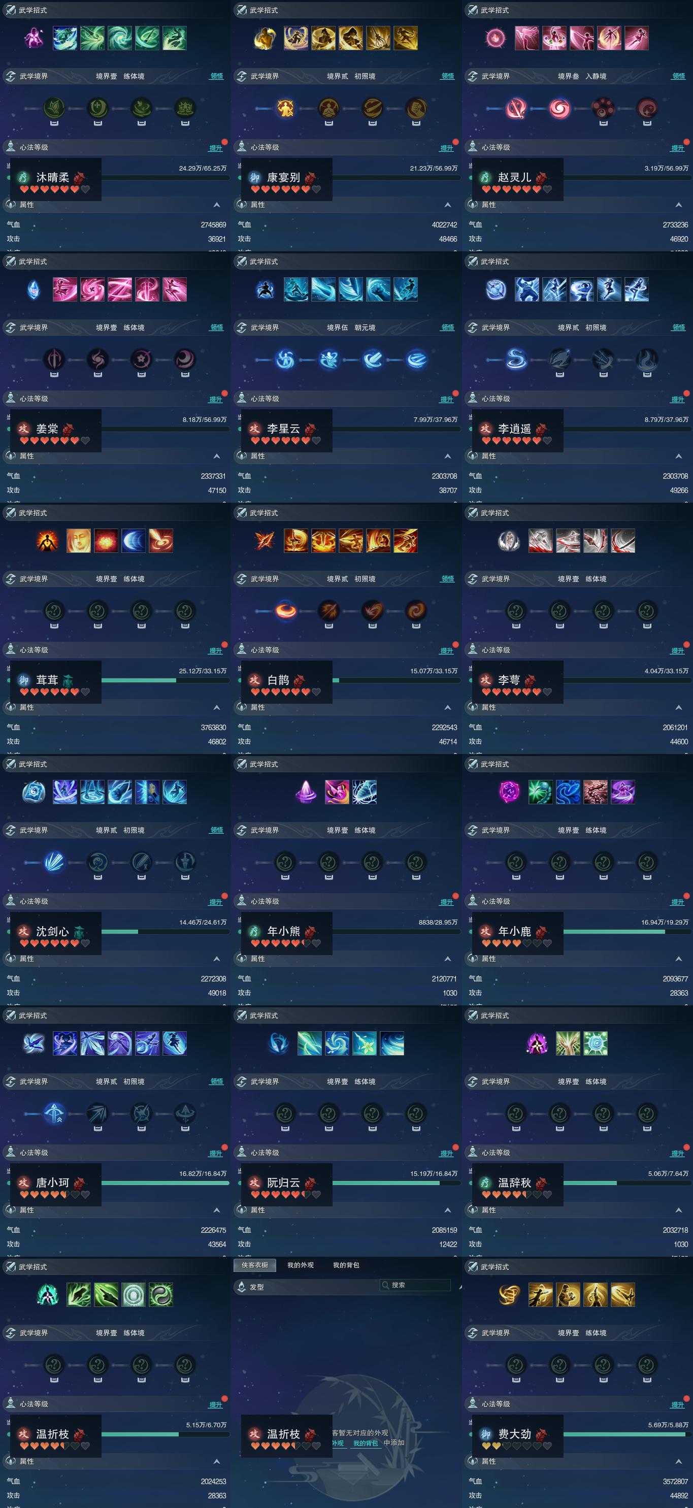 【同伴】沐晴柔81级境界壹,康宴别80级境界贰,赵灵儿80级境界叁,姜棠80级境界壹,李星云77级境界伍,李逍遥77级境界贰,茸茸志76级境界壹,白鹊76级境界贰,李萼76级境界壹,沈剑心75级境界贰,年小熊75级境界壹,年小鹿72级境界壹,唐小珂71级境界贰,阮归云71级境界壹,温辞秋65级境界壹,温折枝64级境界壹,温折枝级,费大劲63级境界壹