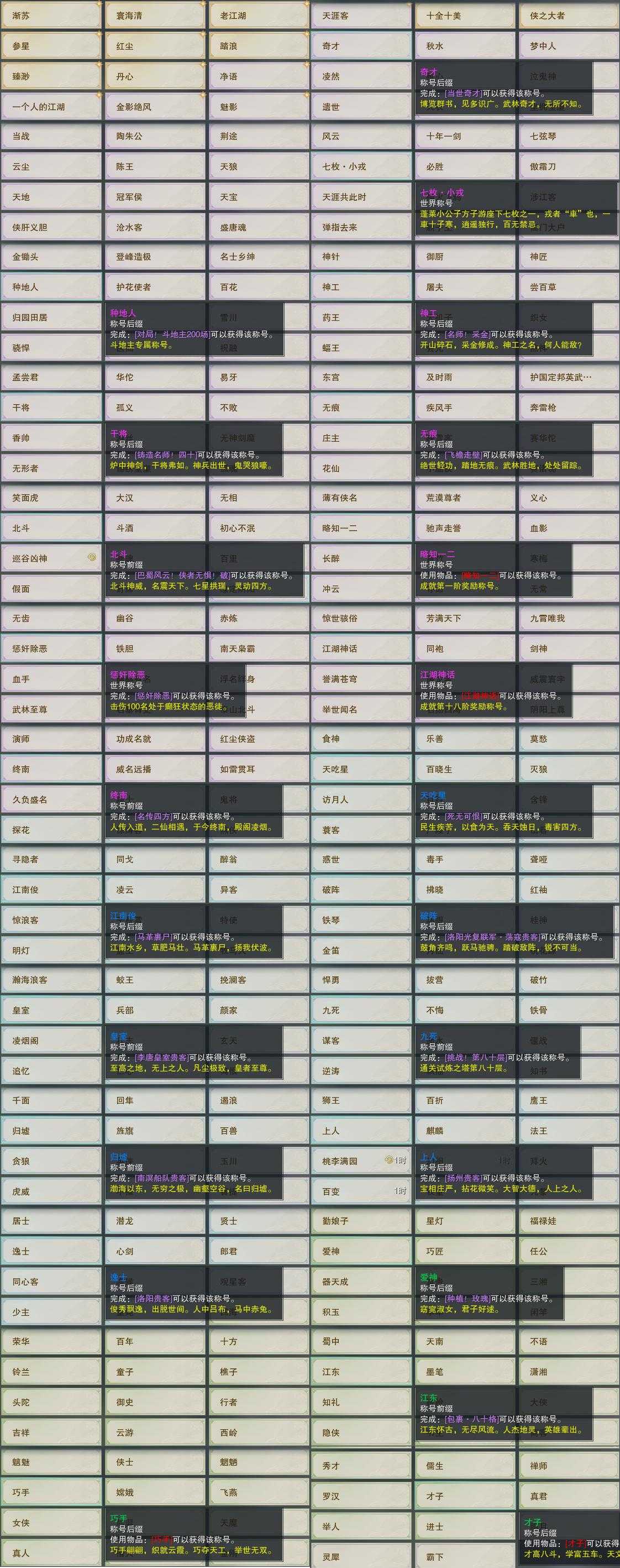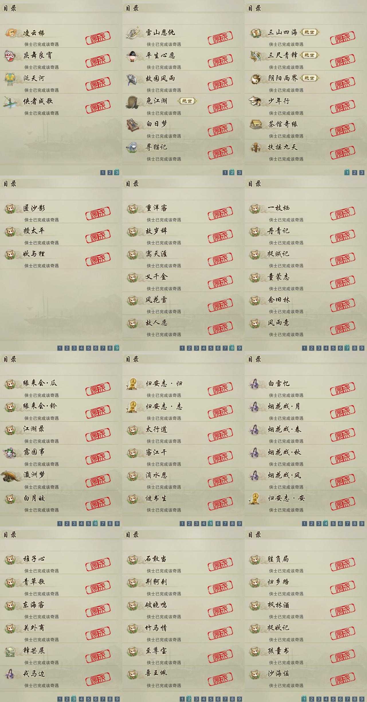 【奇遇】13个[白日梦, 雪山恩仇, 平生心愿, 兔江湖, 少年行, 三尺青锋, 扶摇九天, 寻猫记, 茶馆奇缘, 庆舞良宵, 凌云梯, 泛天河, 侠者成歌]