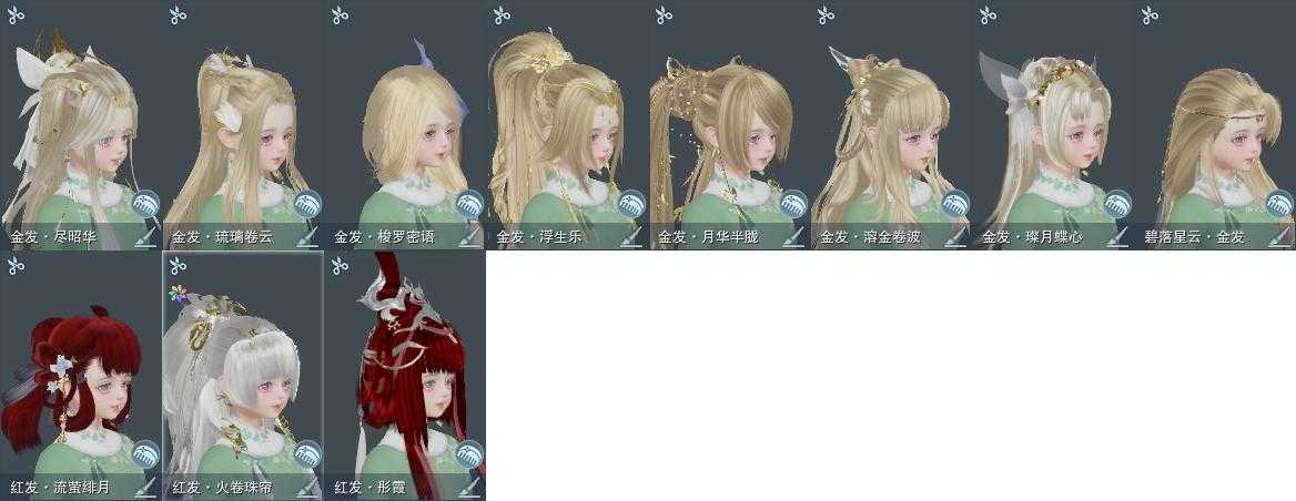 【发型】金发10个[狐金, 资历金, 中秋金, 鸡金, 蝶金, 喵金, 国金, 苏金, 狗金, 龙女金], 红发5个[六红, 羊红, 猴红, 鸡红, 小资历红], 黑发17个, 白发12个, 盒子发型[二代花朝黑, 一代蓝中秋白, 泠月黑发, 狗白, 晴岚绘黑发, 棉袄白, 山吹樱雪黑发, 二代花朝白, 泠月白发, 晴岚绘白发, 山吹樱雪白发], 总页数4