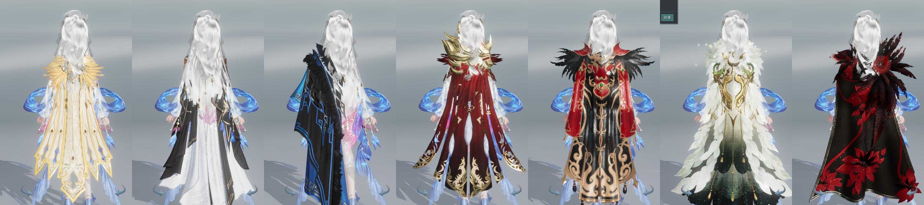 【披风】9个,[衍天预热披风, 一代浩气, 熔金烈风, 7W资历披风, 14W资历披风, 三山披风, 素玉]