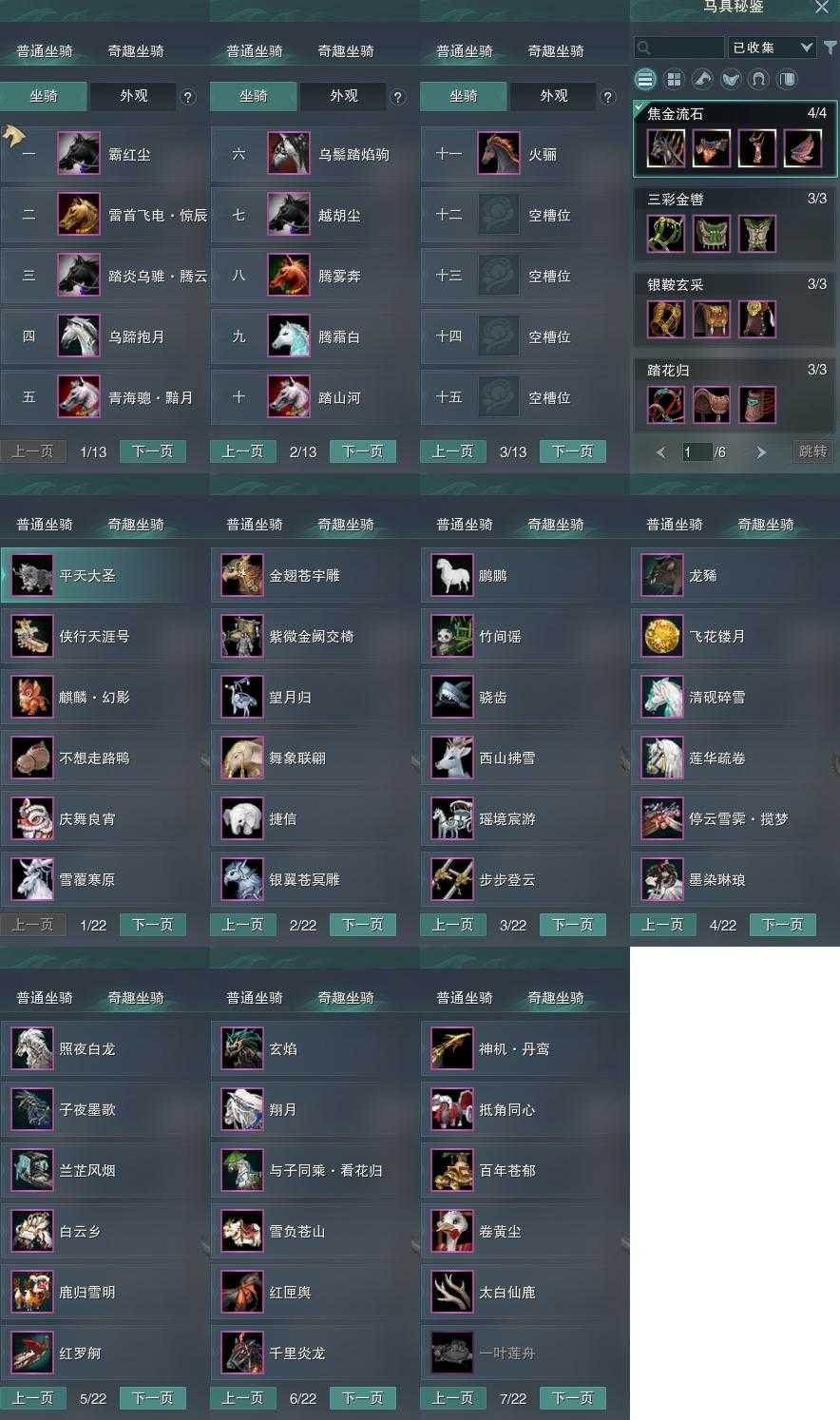【坐骑】11个[踏炎腾云, 青海骢黯月, 乌蹄抱月, 霸红尘, 雷首飞电惊辰, 乌鬃踏焰驹]