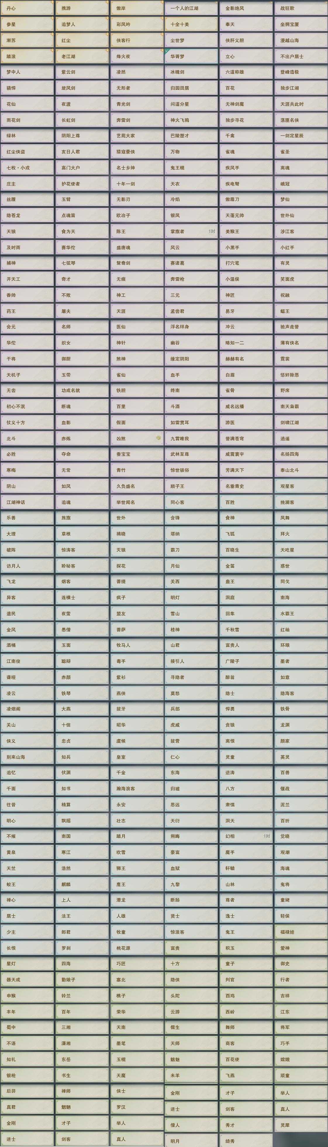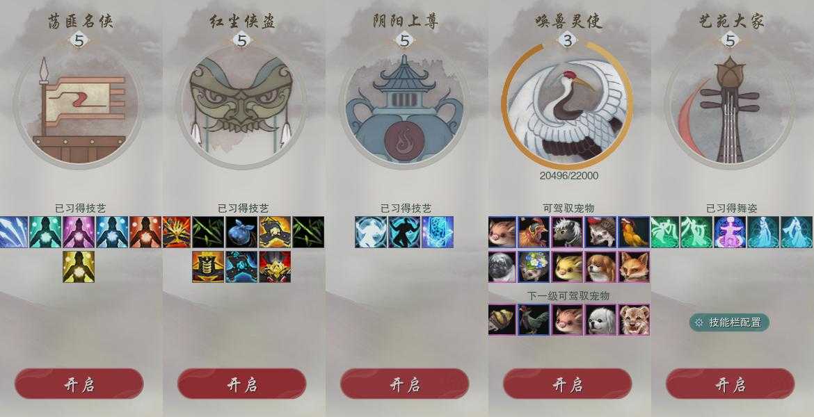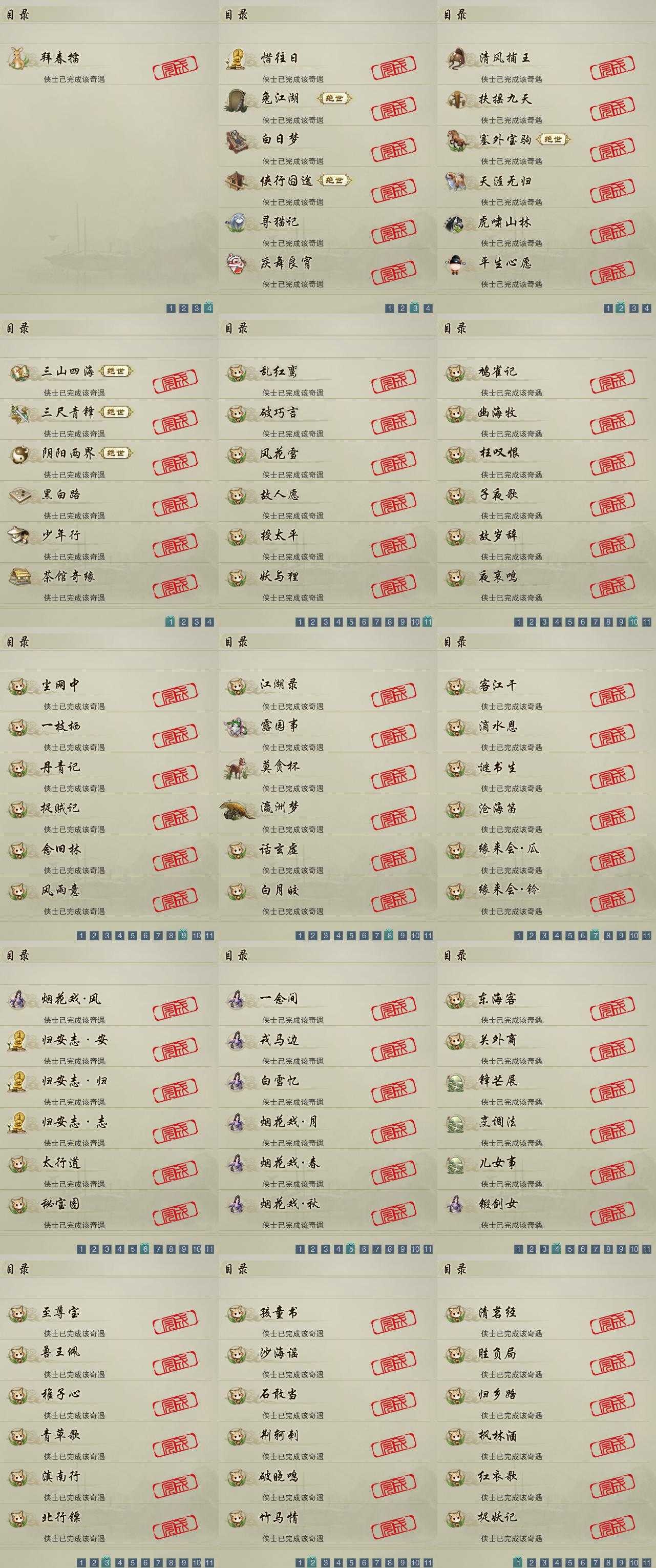 【奇遇】19个[白日梦, 天涯无归, 三山四海, 阴阳两界, 兔江湖, 平生心愿, 黑白路, 惜往日, 塞外宝驹, 虎啸山林, 少年行, 扶摇九天, 三尺青锋, 清风捕王, 侠行囧途, 寻猫记, 茶馆奇缘, 庆舞良宵, 拜春擂]