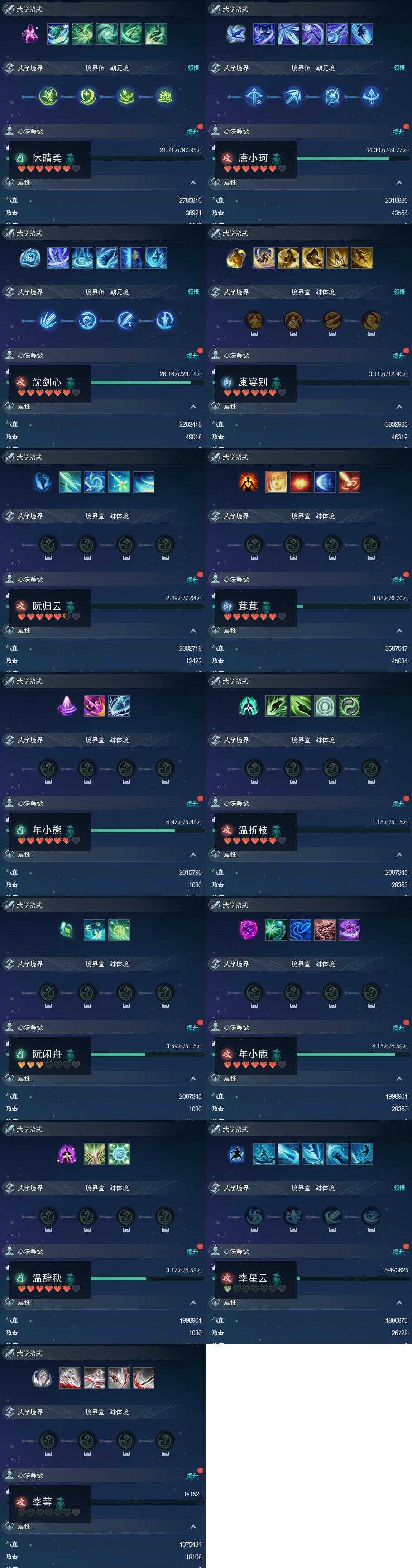【同伴】沐晴柔84级境界伍,唐小珂79级境界伍,沈剑心76级境界伍,康宴别69级境界壹,阮归云65级境界壹,茸茸志64级境界壹,年小熊63级境界壹,温折枝62级境界壹,阮闲舟62级境界壹,年小鹿61级境界壹,温辞秋61级境界壹,李星云39级境界壹,李萼志1级境界壹