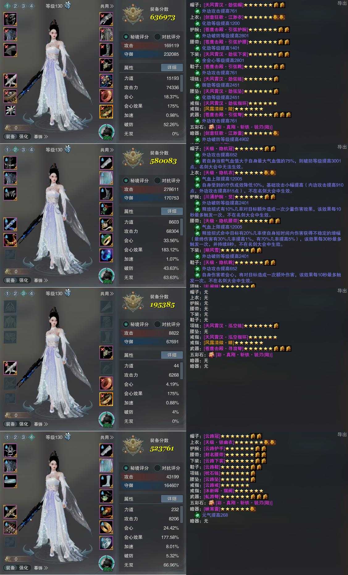 【装备】130级,惊羽诀装备一636973,唐门装备二580083,装备三195385,天罗诡道PVE523761