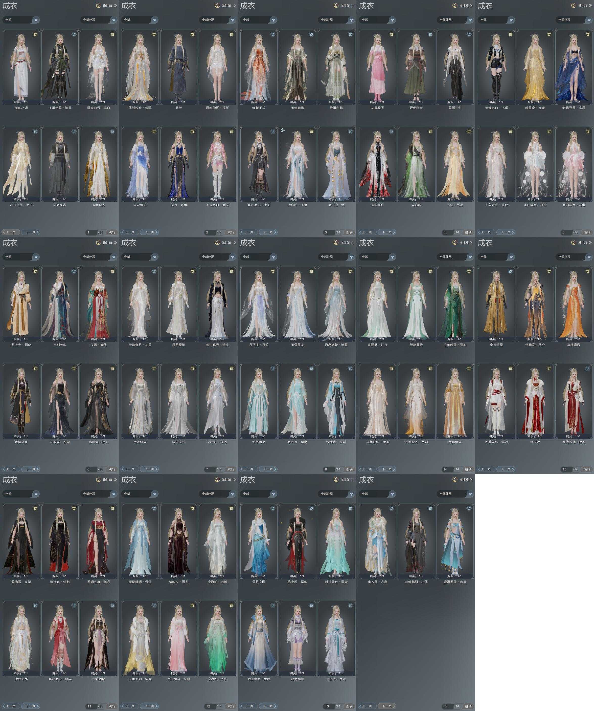 单盒成衣:[一代花朝绿衣, 蓝海岛衣, 红懒猪衣, 红白妖龙衣, 紫月下, 青蛇盒衣, 白蛇盒衣, 仙剑衣, 蓝问刀, 金沙丘衣, 白浮光]