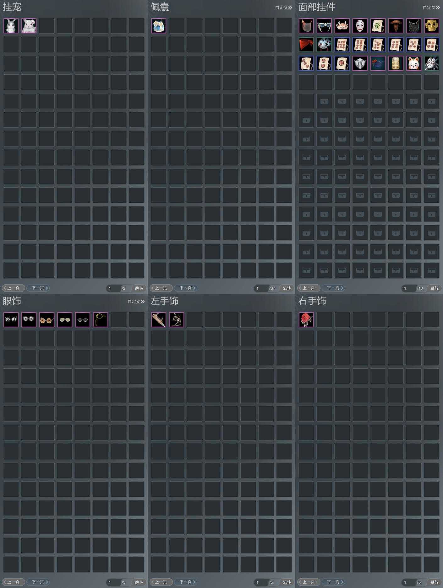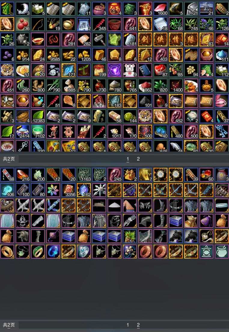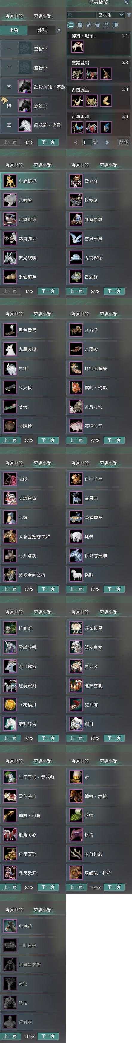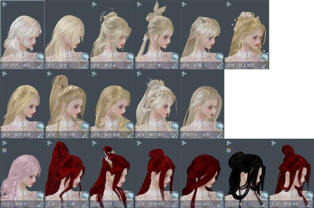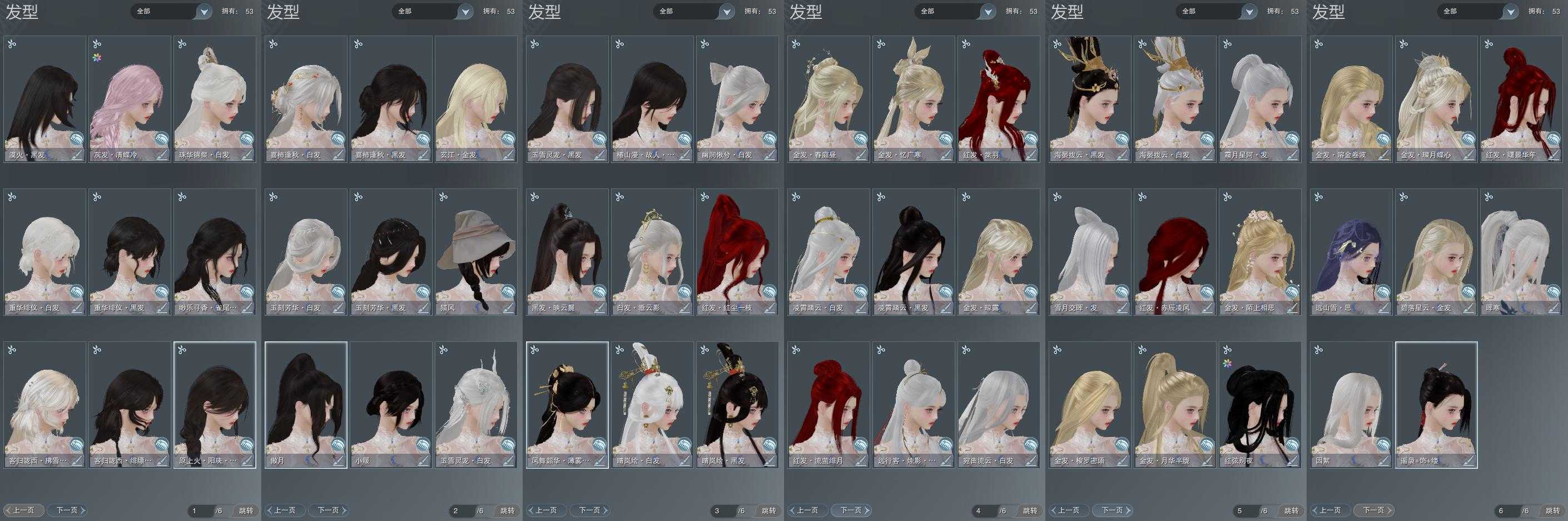 【发型】金发11个[狐金, 兔金, 资历金, 鼠金, 鸡金, 蝶金, 考金, 苏金, 珊瑚金, 玄江金发, 白陇西金发], 红发7个[八红, 十红, 十二红, 蝶粉, 猴红, 鸡红, 小资历红], 黑发18个, 白发16个, 盒子发型[狄仁杰黑, 踏云黑发, 白端午白发, 狄仁杰白, 二代重阳白, 晴岚绘黑发, 雪月白发, 红腿白, 踏云白发, 晴岚绘白发, 薄雾黑发, 幽涧愀兮白发, 黑椿山黑发, 灵龙盒黑发, 灵龙白发, 柿盒黑发, 黄上火黑发, 柿盒白发, 粉陇西黑发, 蓝寻香黑发], 总页数6