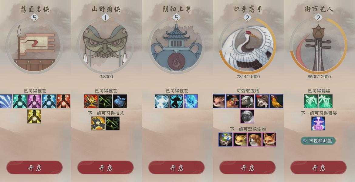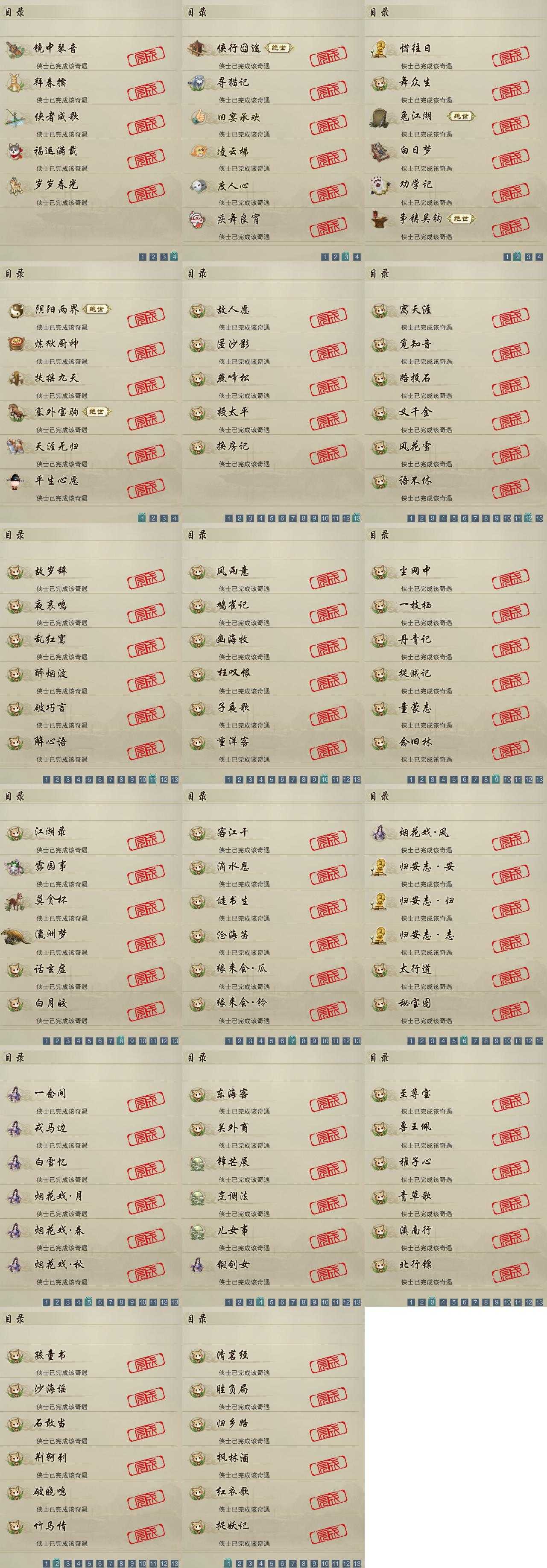 【奇遇】22个[白日梦, 天涯无归, 劝学记, 阴阳两界, 兔江湖, 平生心愿, 惜往日, 塞外宝驹, 争铸吴钩, 扶摇九天, 舞众生, 侠行囧途, 寻猫记, 庆舞良宵, 凌云梯, 炼狱厨神, 度人心, 旧宴承欢, 镜中琴音, 侠者成歌, 拜春擂, 福运满载]