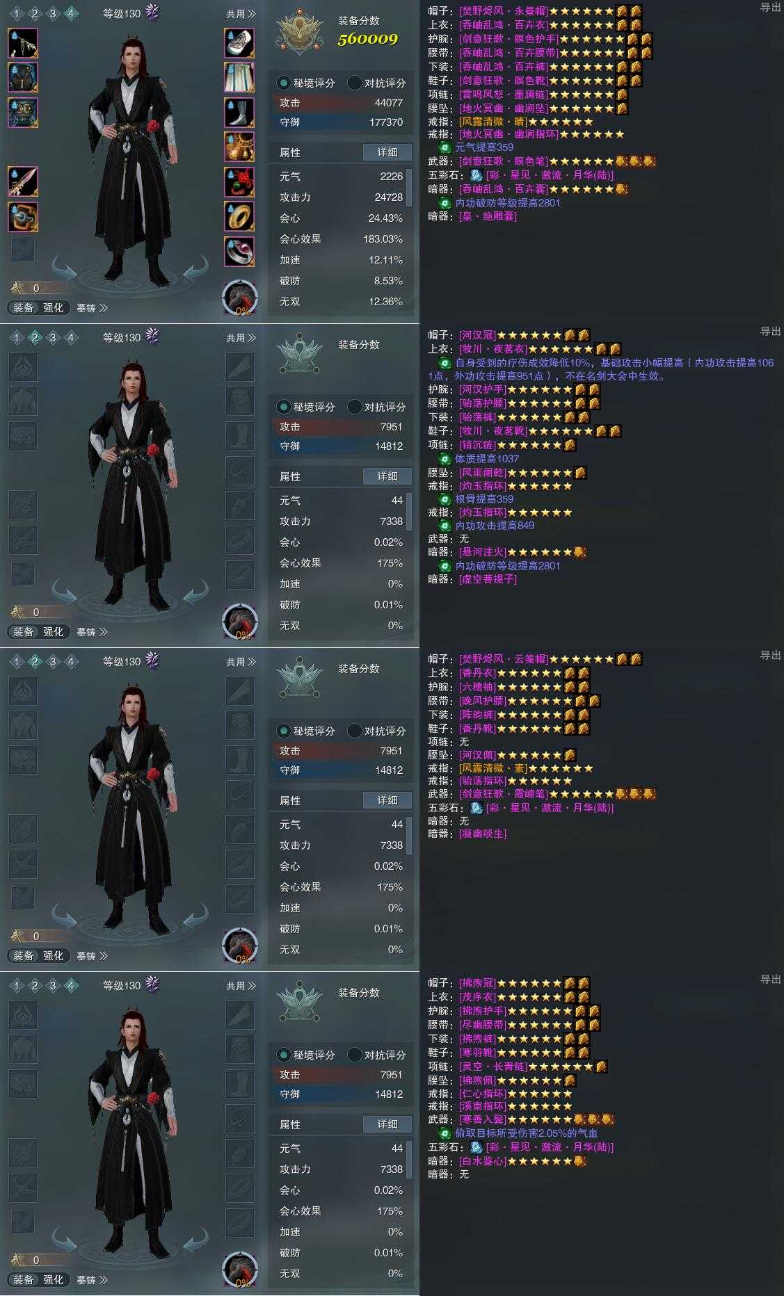 【装备】130级,花间游装备一560009,装备二0,装备三0,装备四0