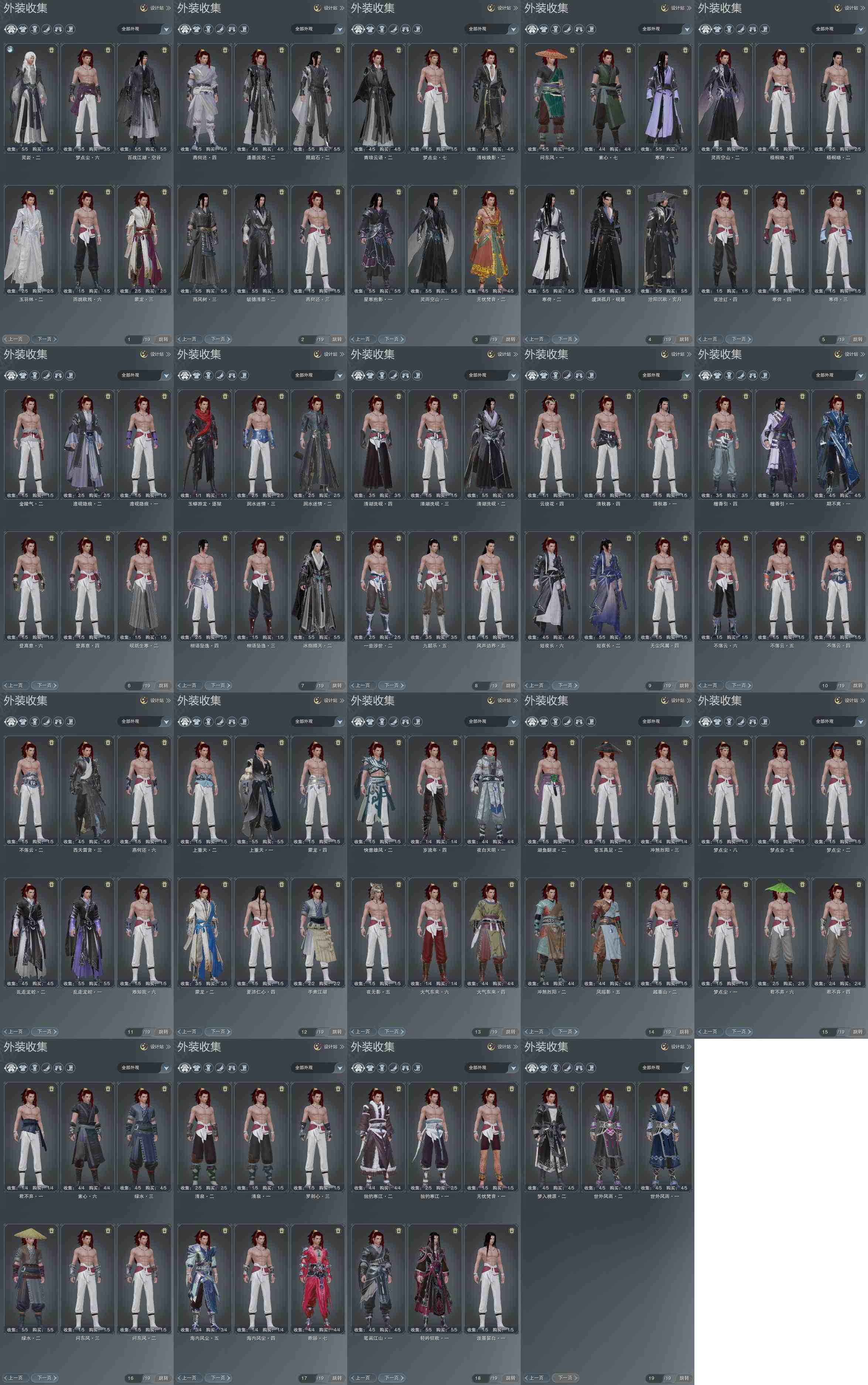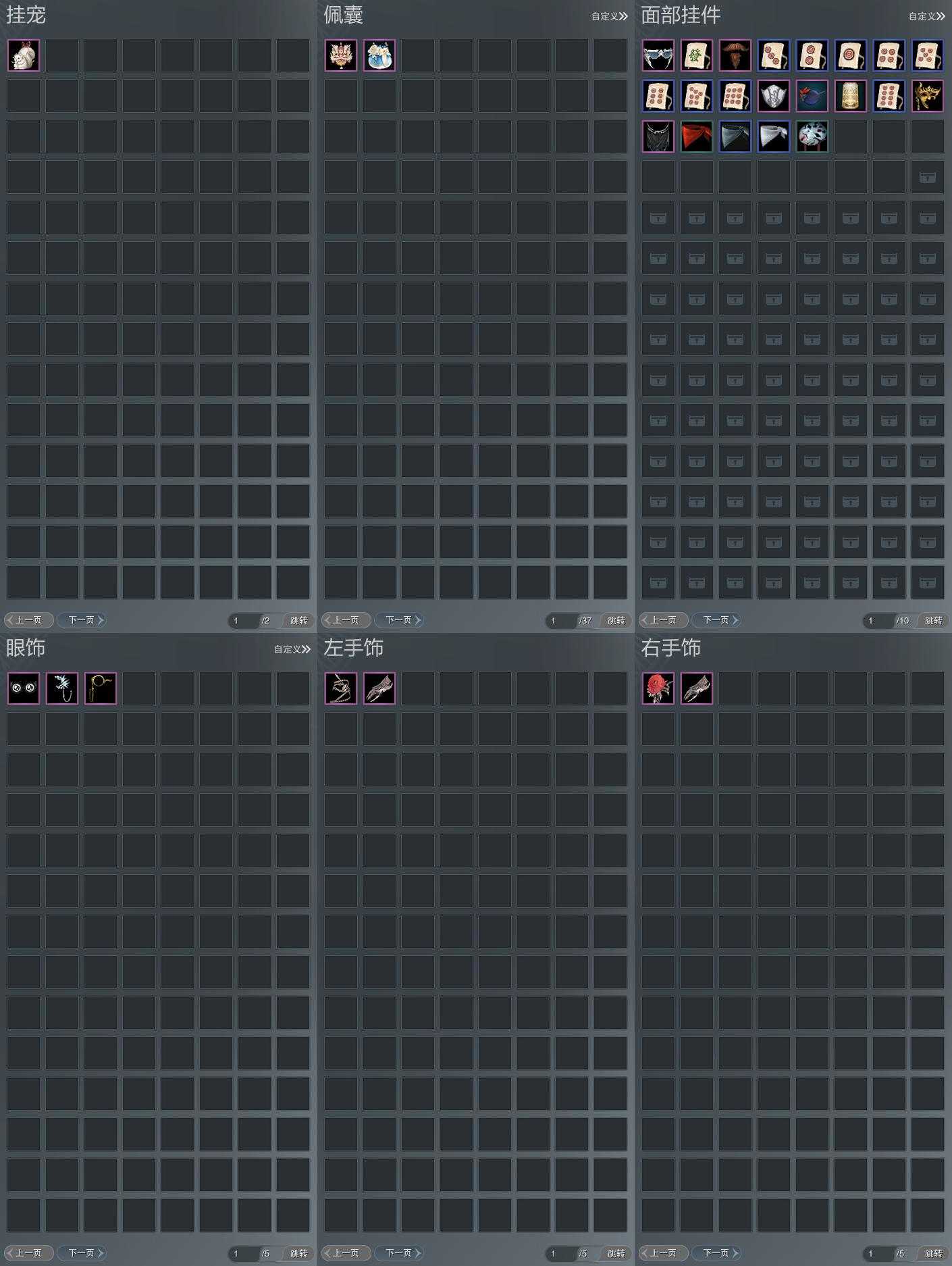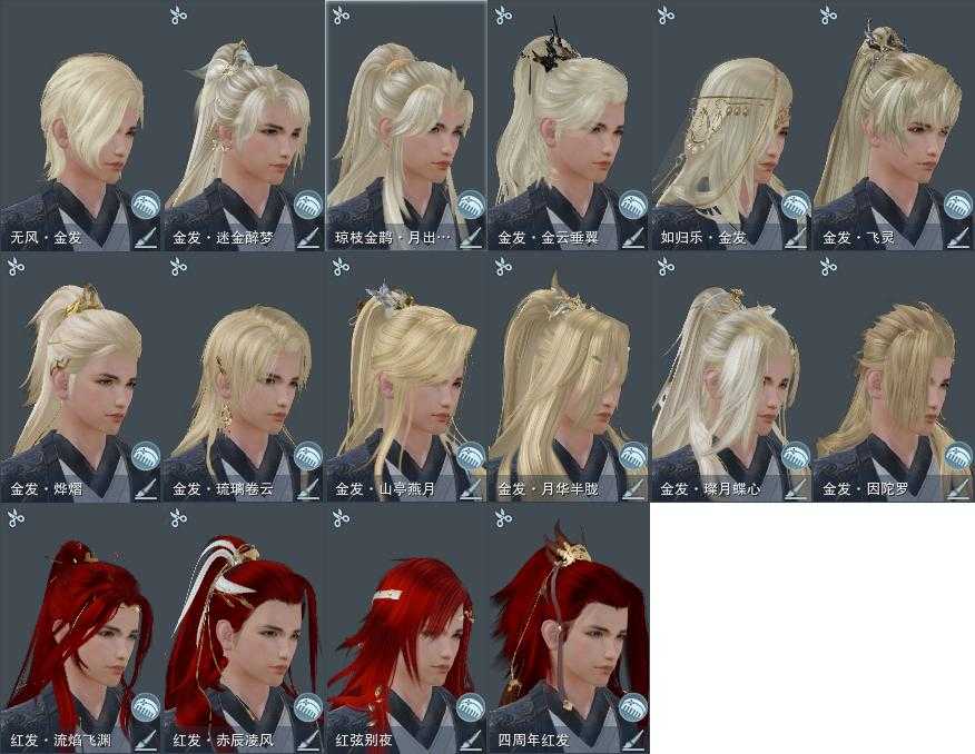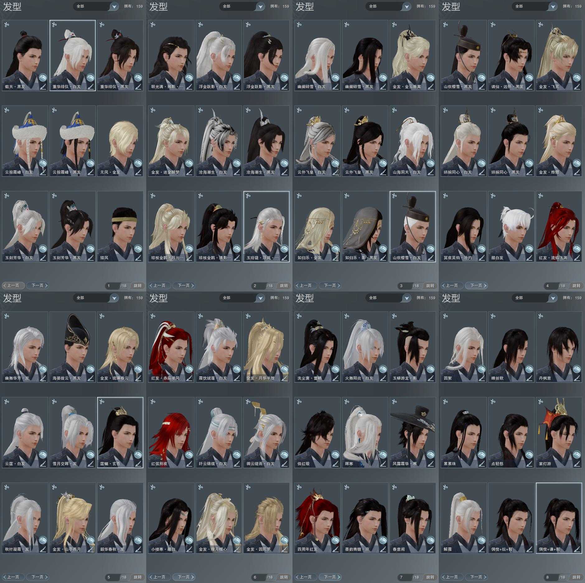 【发型】金发12个[狐金, 猴金, 鸡金, 国金, 龙女金, 猪金, 飒金, 苍金, 如归金, 牛金, 无风金发, 澄琼枝金发], 红发4个[四红, 八红, 九红, 鸡红], 黑发30个, 白发24个, 盒子发型[狄仁杰黑, 二代七夕白, 一代重阳白, 四代七夕黑发, 黑谪仙黑发, 雪月白发, 山吹樱雪黑发, 四代七夕白发, 飞皇黑发, 幽阑黑发, 山吹樱雪白发, 飞皇白发, 幽阑白发, 绿琼枝黑发, 浮岚白发, 沧海黑发, 沧海白发, 小金龙黑发, 黑明光黑发, 小金龙白发, 云掠霜峰黑发, 云掠霜峰白发], 总页数9