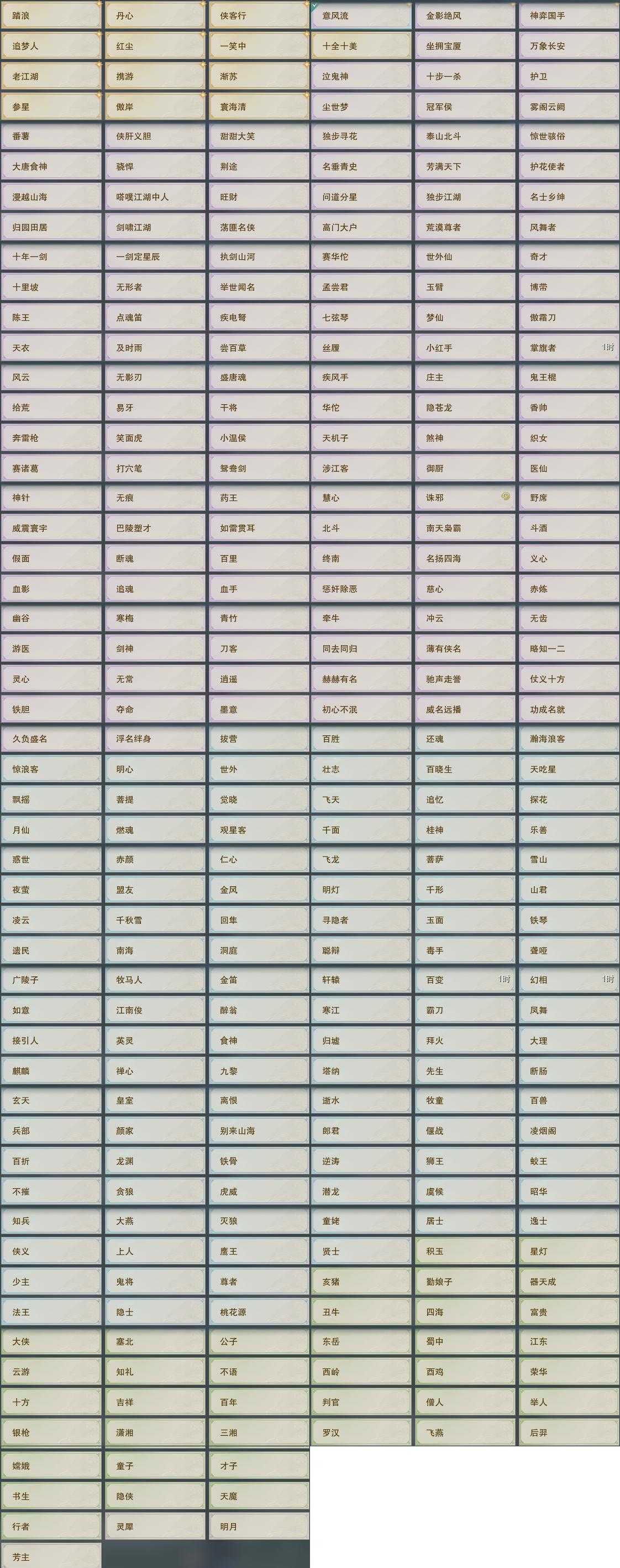 【同伴】康宴别82级境界伍,沐晴柔81级境界伍,盖聂志81级境界贰,卫庄志81级境界贰,月嘉禾80级境界伍,李星云79级境界伍,唐小珂77级境界壹,沈剑心77级境界伍,贺闲志77级境界壹,白鹊志77级境界叁,李逍遥74级境界壹,姜棠志63级境界壹,赵灵儿42级境界壹,温折枝1级境界壹,年小鹿1级境界壹,阮归云1级境界壹,温辞秋1级境界壹,年小熊1级境界壹,阮闲舟1级境界壹,茸茸志1级境界壹,费大劲1级境界壹