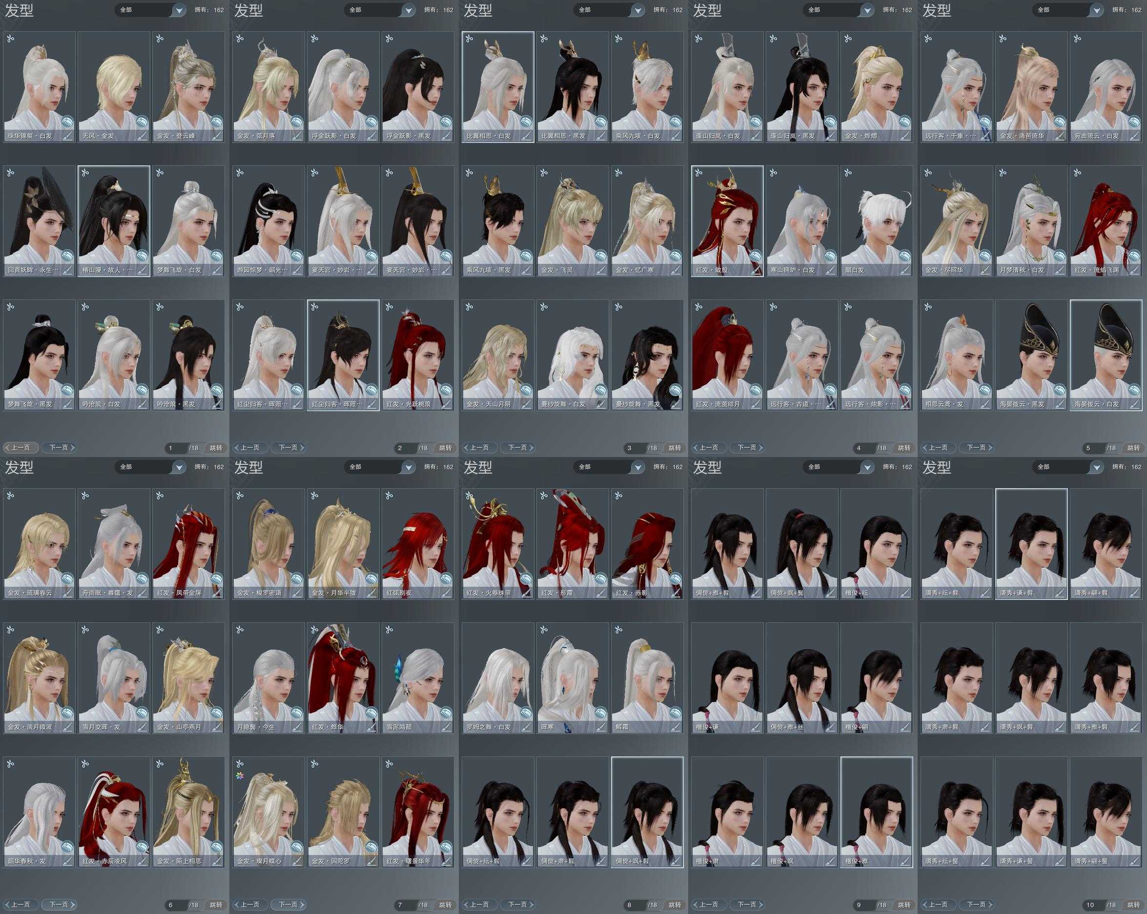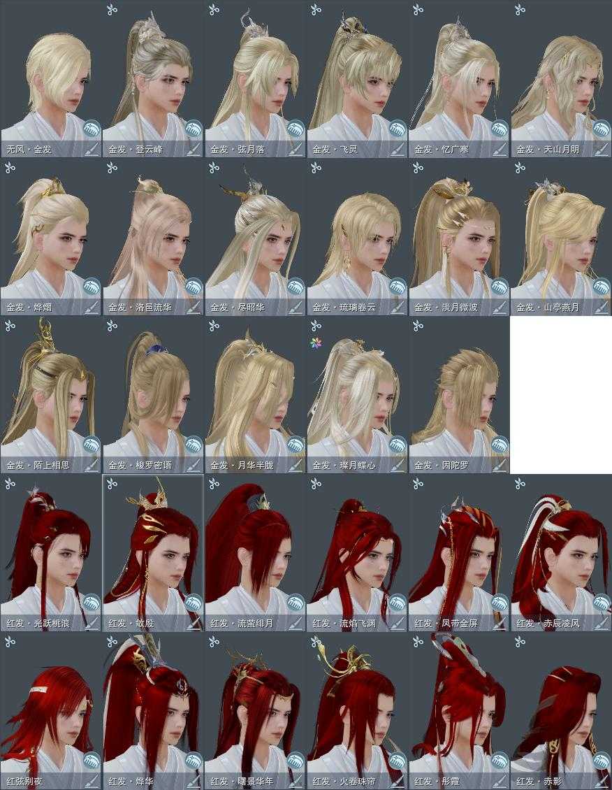 【发型】金发17个[狐金, 猴金, 兔金, 资历金, 中秋金, 鸡金, 考金, 国金, 倒闭金, 龙女金, 玫瑰金, 猪金, 丝路金, 飒金, 巴卡金, 三代金, 无风金发], 红发12个[五红, 六红, 七红, 八红, 九红, 十一红, 羊红, 猴红, 鸡红, 狗红, 猪红, 小资历红], 黑发16个, 白发24个, 盒子发型[二代花朝黑, 一代蓝中秋白, 丝路黑, 一代七夕白, 狄仁杰黑, 二代七夕白, 一代花朝白白, 狄仁杰白, 二代重阳白, 三代中秋白, 三代七夕白, 雪月白发, 棉袄白, 二代花朝白, 丝路白, 二代乘风黑发, 五代七夕黑发, 二代乘风白发, 五代七夕白发, 黑红尘黑发, 黑狮黑发, 白游园黑发, 小金龙黑发, 黑红尘白发, 黑狮白发, 竹笛黑发, 小熊黑发, 小金龙白发, 竹笛白发, 小熊白发, 黑椿山黑发, 棕黑妖眸盒黑发], 总页数10