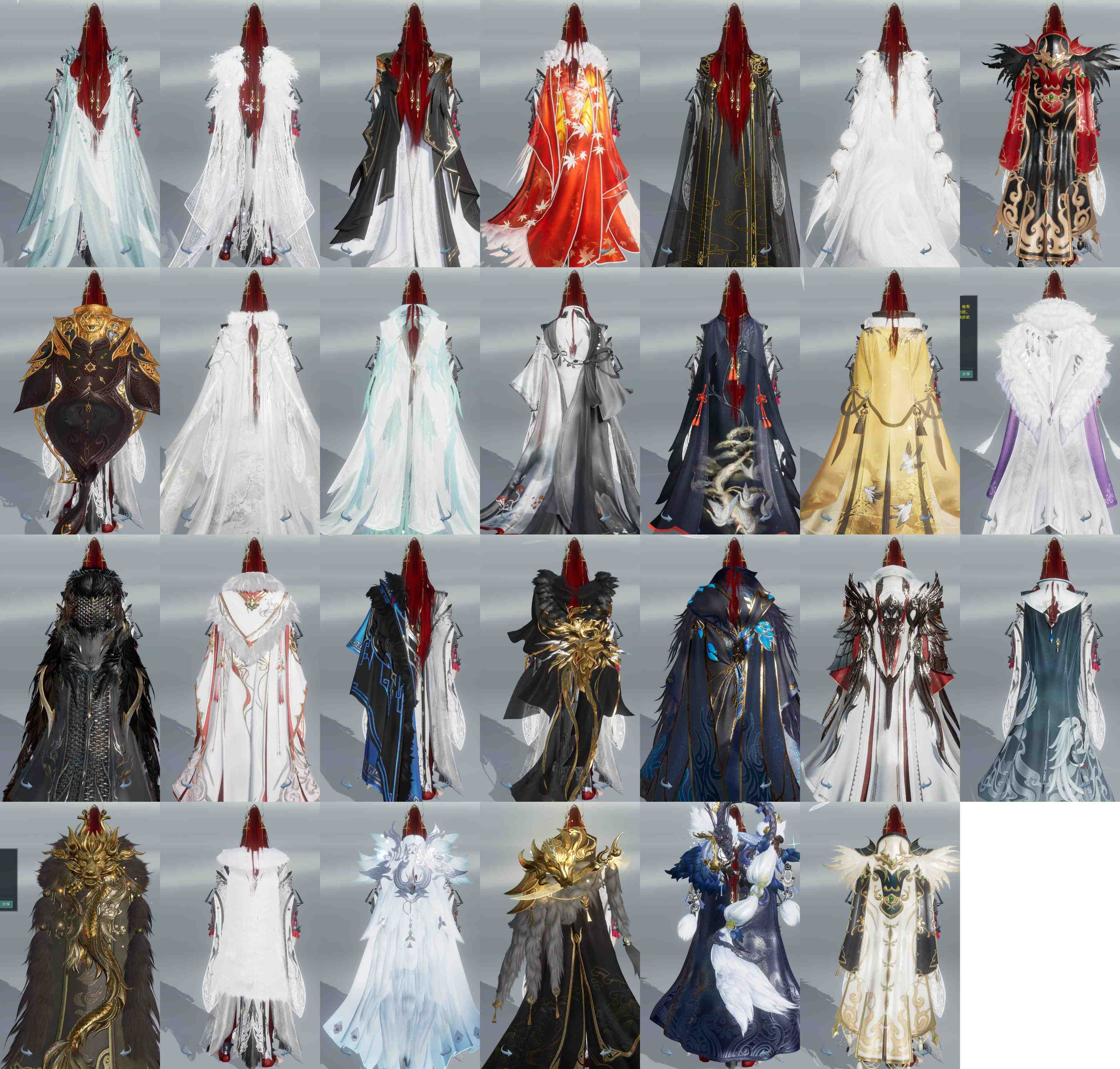 【披风】31个,[衍天预热披风, 7W资历披风, 天火之眼, 雪啸刚风, 一代浩气, 黑盒子披风, 情R枕, 青盒子披风, 唐盒子披风, 白盒子披风, 粉盒子披风, 二代白, 叽盒子披风, 秃盒子披风, 歌盒子披风, 猪盒子披风, 周公御龙, 狼头, 羽毛, 龙头, 黑山河, 枫叶, 黑狄仁杰, 白狐裘, 玄锦流渊, 玉鸾雪, 云麒赫奕]