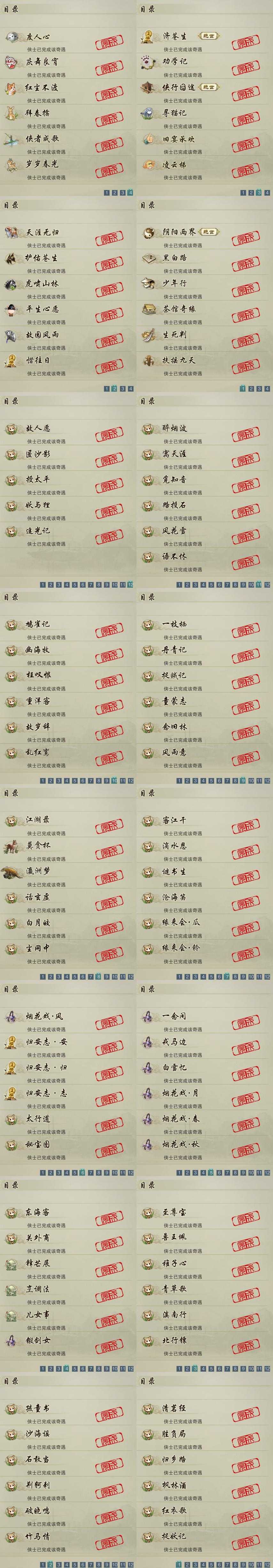 【奇遇】23个[天涯无归, 劝学记, 阴阳两界, 平生心愿, 黑白路, 惜往日, 虎啸山林, 济苍生, 护佑苍生, 少年行, 故园风雨, 扶摇九天, 侠行囧途, 寻猫记, 茶馆奇缘, 庆舞良宵, 生死判, 凌云梯, 度人心, 旧宴承欢, 红尘不渡, 侠者成歌, 拜春擂]