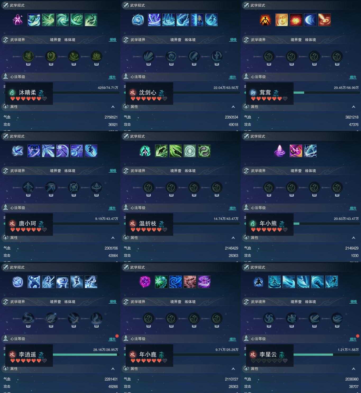 【同伴】沐晴柔82级境界壹,沈剑心82级境界壹,茸茸80级境界壹,唐小珂78级境界壹,温折枝78级境界壹,年小熊78级境界壹,李逍遥75级境界壹,年小鹿74级境界壹,李星云53级境界壹