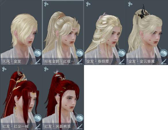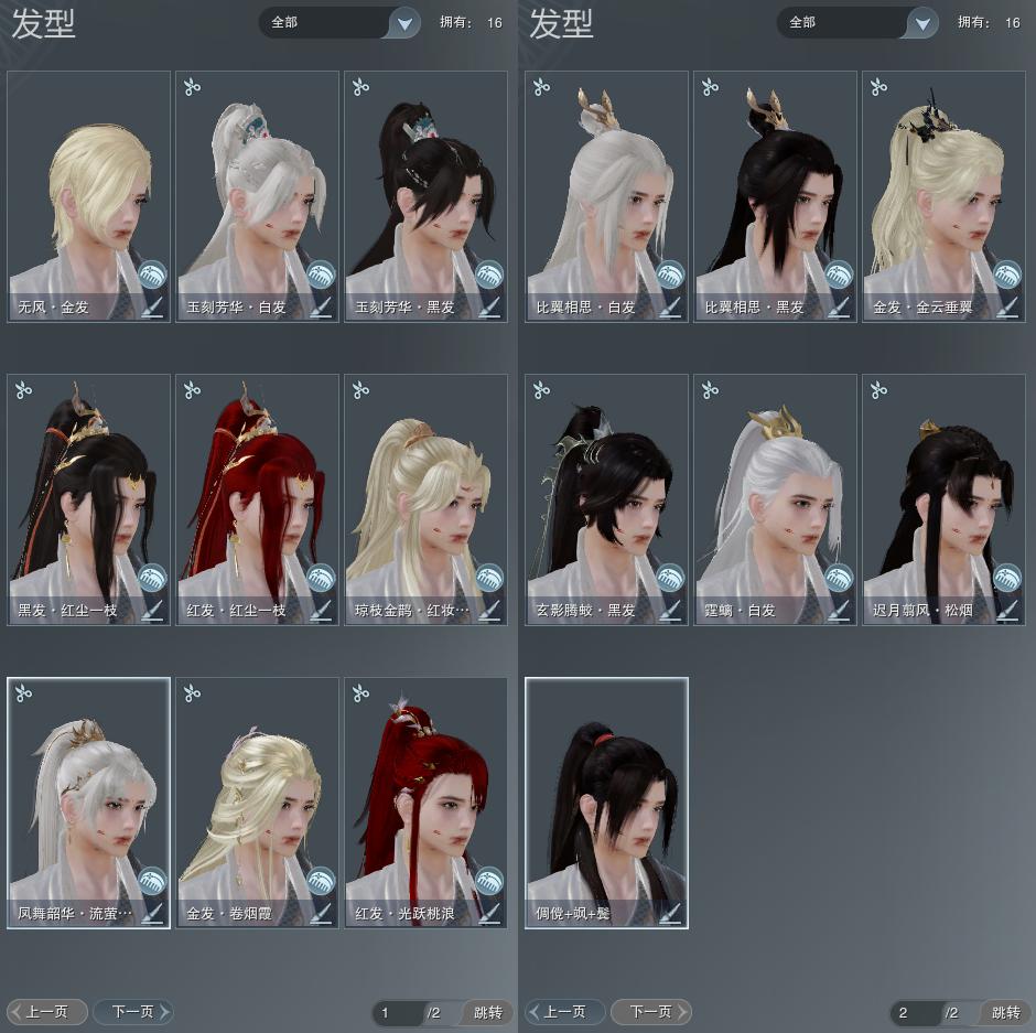 【发型】金发4个[苍金, 角金, 无风金发, 红琼枝金发], 红发2个[十一红, 十二红], 黑发5个, 白发3个, 盒子发型[小白龙黑发, 五代七夕黑发, 五代七夕白发, 流萤白发, 十二黑], 总页数2