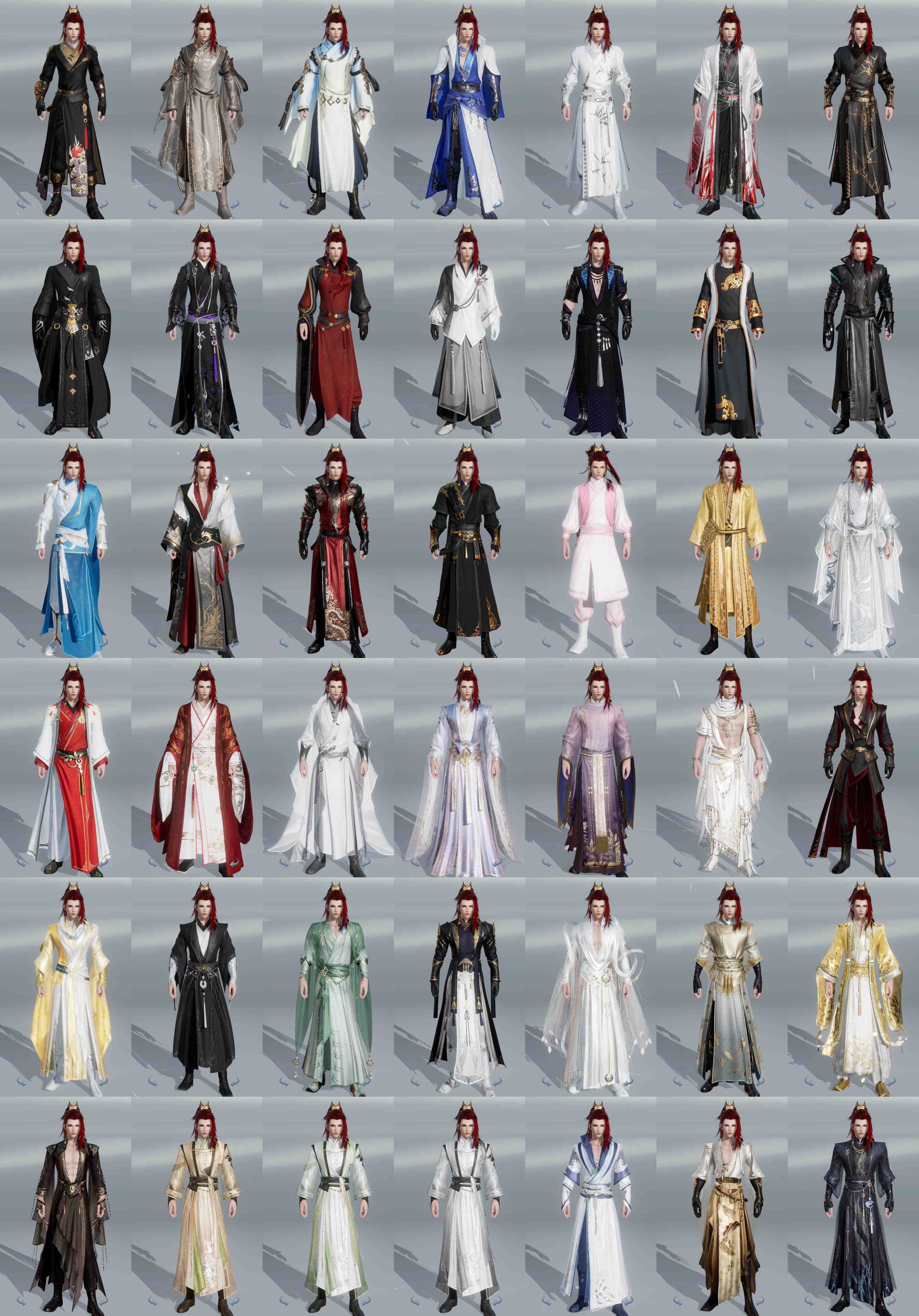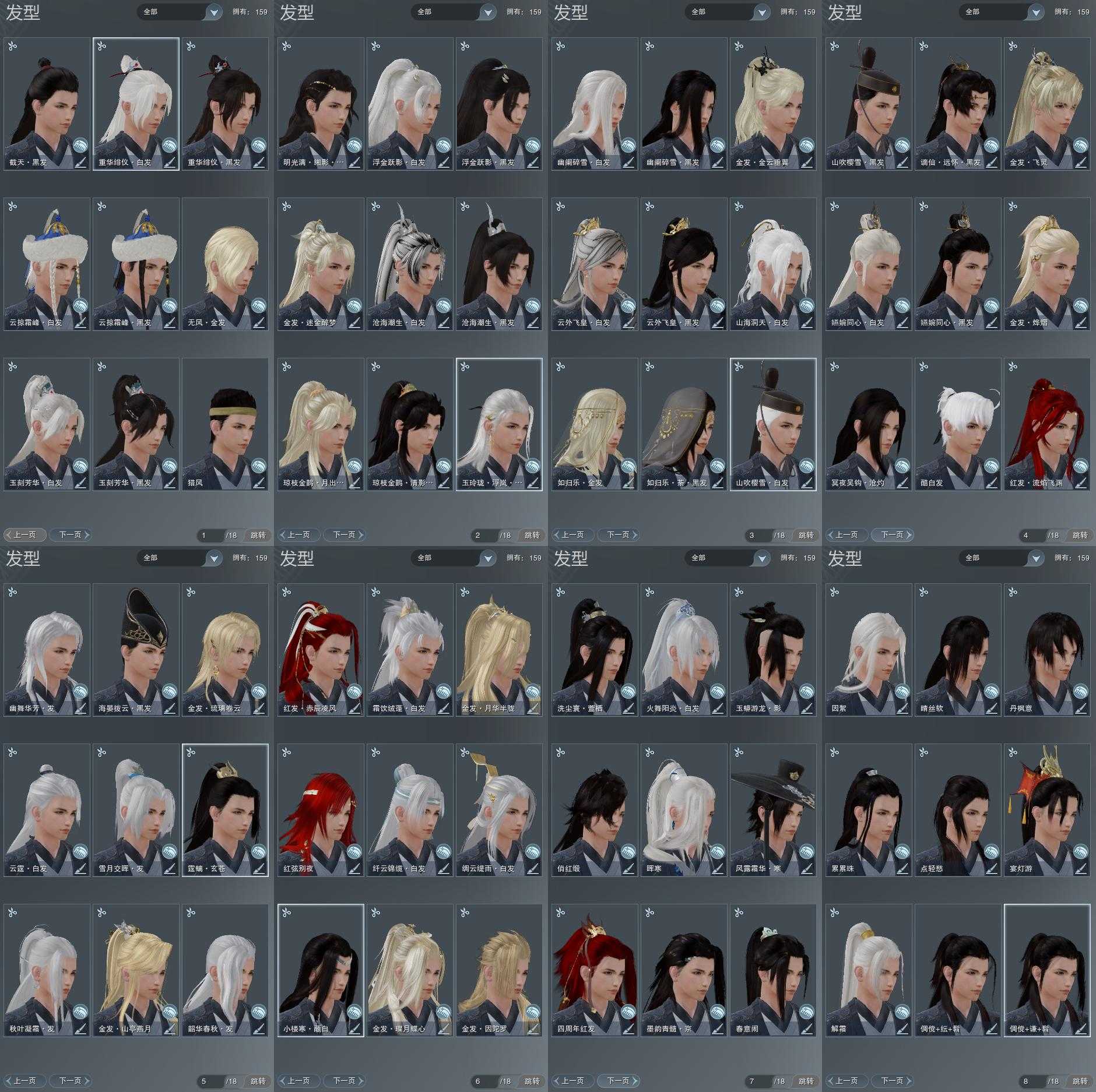 【发型】金发12个[狐金, 猴金, 鸡金, 国金, 龙女金, 猪金, 飒金, 苍金, 如归金, 牛金, 无风金发, 澄琼枝金发], 红发4个[四红, 八红, 九红, 鸡红], 黑发30个, 白发24个, 盒子发型[狄仁杰黑, 二代七夕白, 一代重阳白, 四代七夕黑发, 黑谪仙黑发, 雪月白发, 山吹樱雪黑发, 四代七夕白发, 飞皇黑发, 幽阑黑发, 山吹樱雪白发, 飞皇白发, 幽阑白发, 绿琼枝黑发, 浮岚白发, 沧海黑发, 沧海白发, 小金龙黑发, 黑明光黑发, 小金龙白发, 云掠霜峰黑发, 云掠霜峰白发], 总页数9