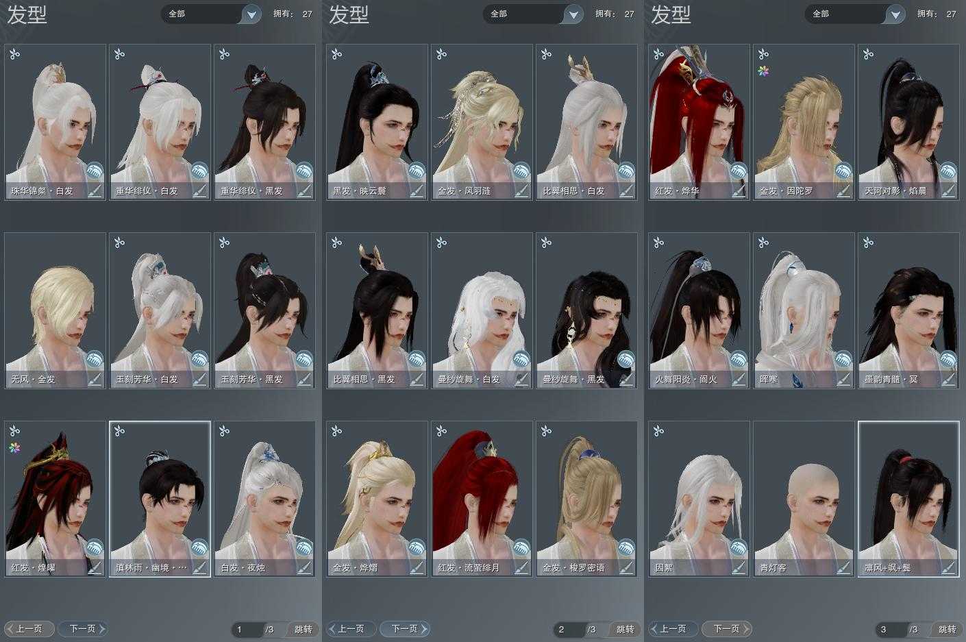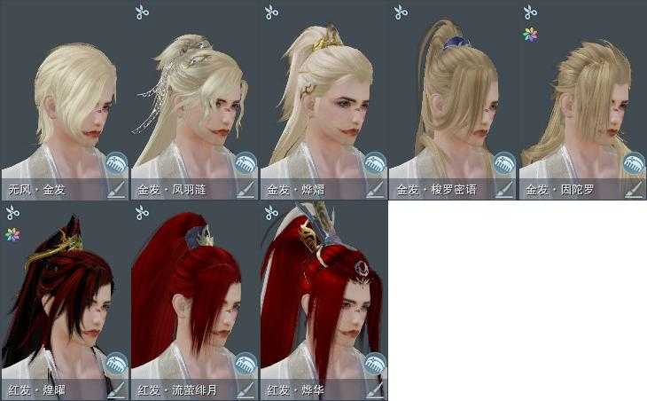 【发型】金发5个[猴金, 资历金, 猪金, 凤金, 无风金发], 红发3个[七红, 兔红, 小资历红], 黑发10个, 白发8个, 盒子发型[丝路黑, 丝路白, 五代七夕黑发, 五代七夕白发, 黑傣族黑发], 总页数3
