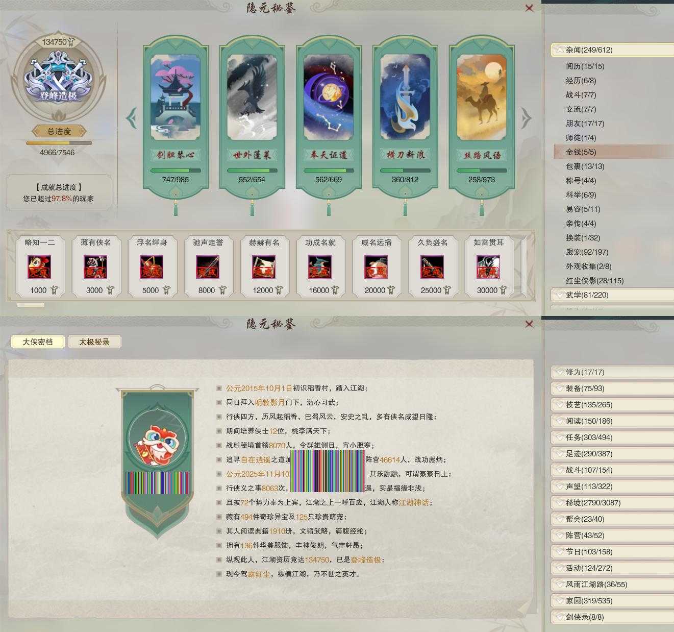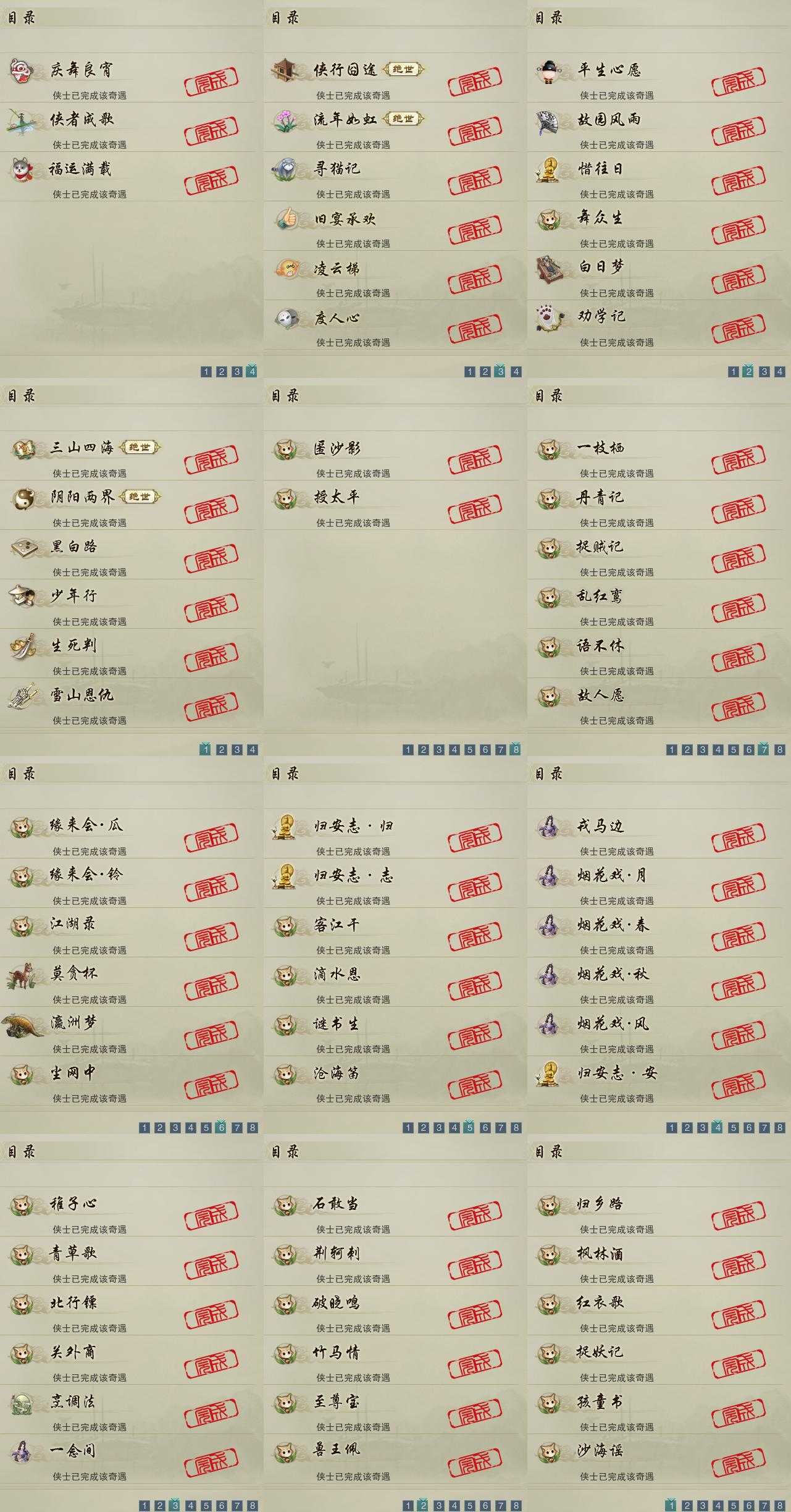 【奇遇】21个[白日梦, 三山四海, 劝学记, 阴阳两界, 雪山恩仇, 平生心愿, 黑白路, 惜往日, 少年行, 故园风雨, 流年如虹, 舞众生, 侠行囧途, 寻猫记, 庆舞良宵, 生死判, 凌云梯, 度人心, 旧宴承欢, 侠者成歌, 福运满载]