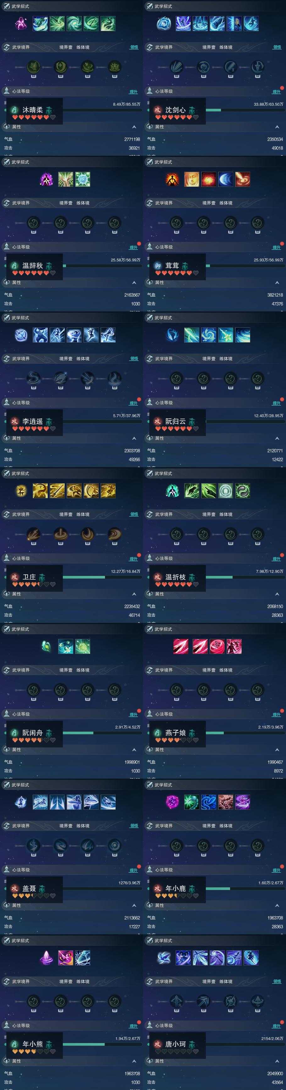 【同伴】沐晴柔83级境界壹,沈剑心82级境界壹,温辞秋80级境界壹,茸茸志80级境界壹,李逍遥77级境界壹,阮归云75级境界壹,卫庄志71级境界壹,温折枝69级境界壹,阮闲舟61级境界壹,燕子娘60级境界壹,盖聂志60级境界壹,年小鹿57级境界壹,年小熊57级境界壹,唐小珂55级境界壹