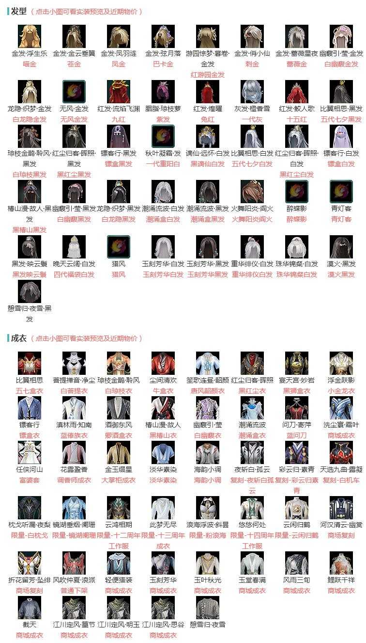 【发型】金发10个[喵金, 苍金, 凤金, 巴卡金, 红游园金发, 刺金, 蔷薇金, 白幽馥金发, 白龙隐金发, 无风金发], 红发5个[九红, 紫发, 兔红, 一代灰, 十五红], 黑发6个, 白发9个, 盒子发型[五代七夕黑发, 白琼枝黑发, 黑红尘黑发, 镖盒黑发, 一代重阳白, 黑谪仙白发, 五代七夕白发, 黑红尘白发, 镖盒白发, 黑椿山黑发, 白幽馥黑发, 白龙隐黑发, 潮涌盒白发, 潮涌盒黑发, 粉毛衣黑发]