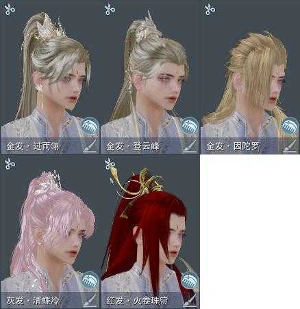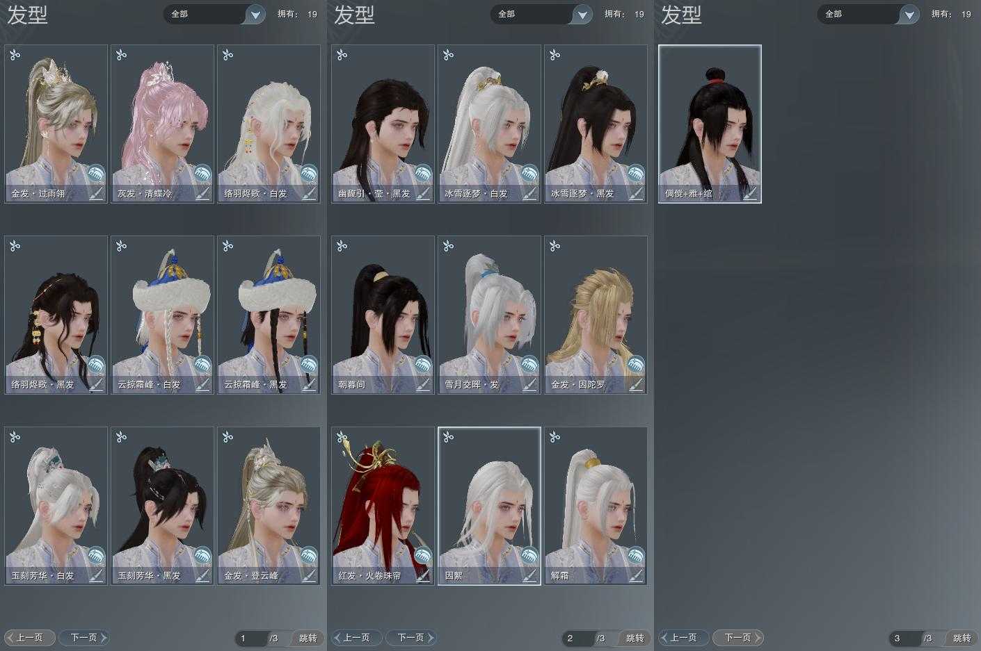 【发型】金发3个[猴金, 三代金, 翎金], 红发2个[六红, 蝶粉], 黑发6个, 白发7个, 盒子发型[雪月白发, 花滑黑发, 花滑白发, 白幽馥黑发, 云掠霜峰黑发, 云掠霜峰白发, 络羽黑发, 络羽白发], 总页数3