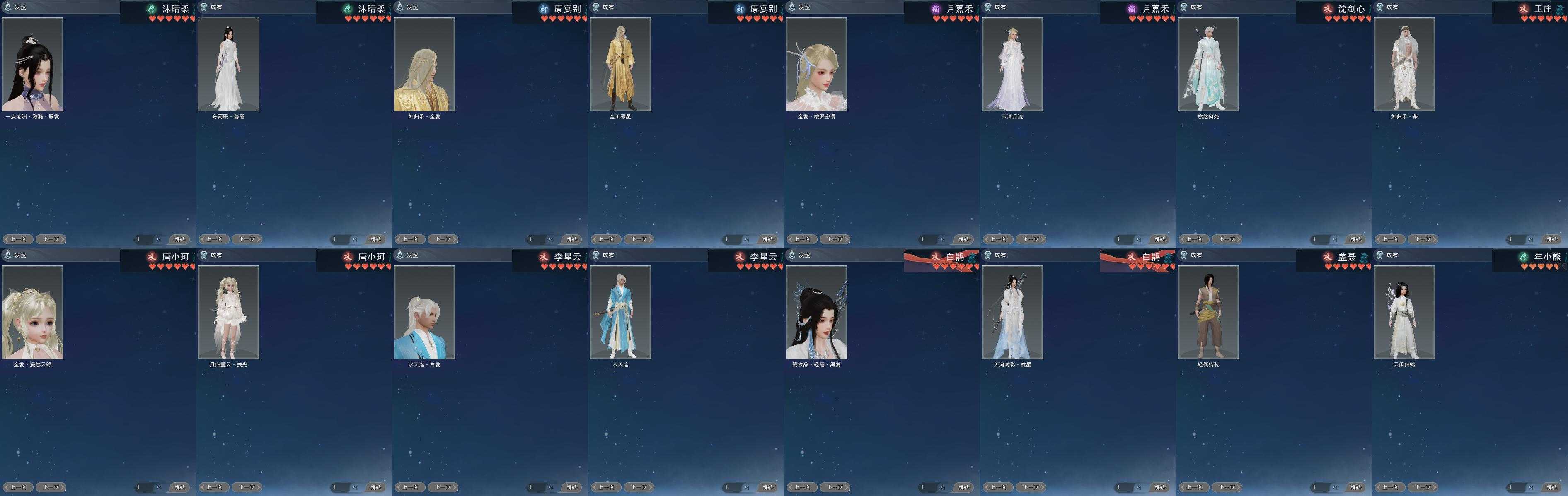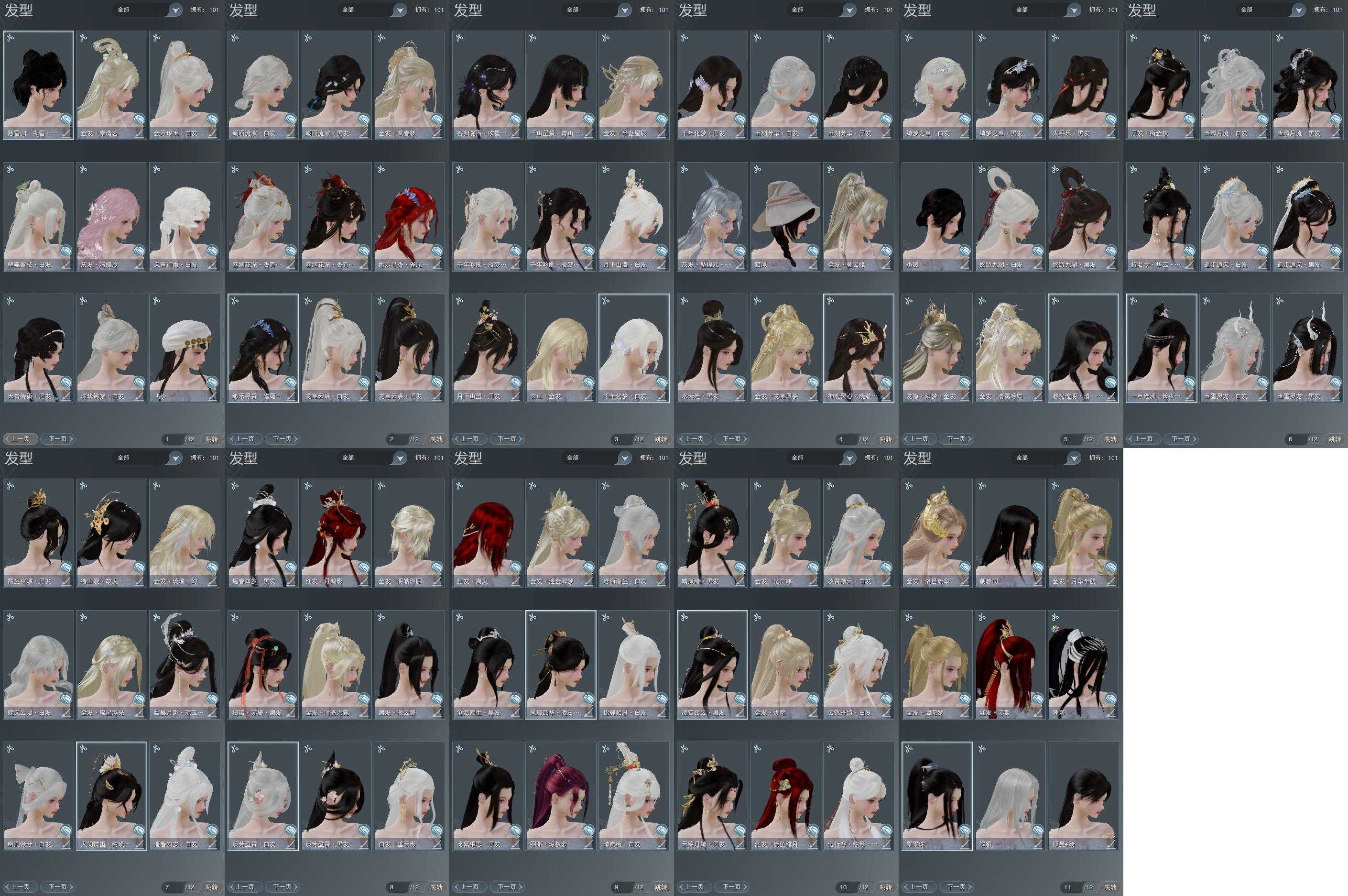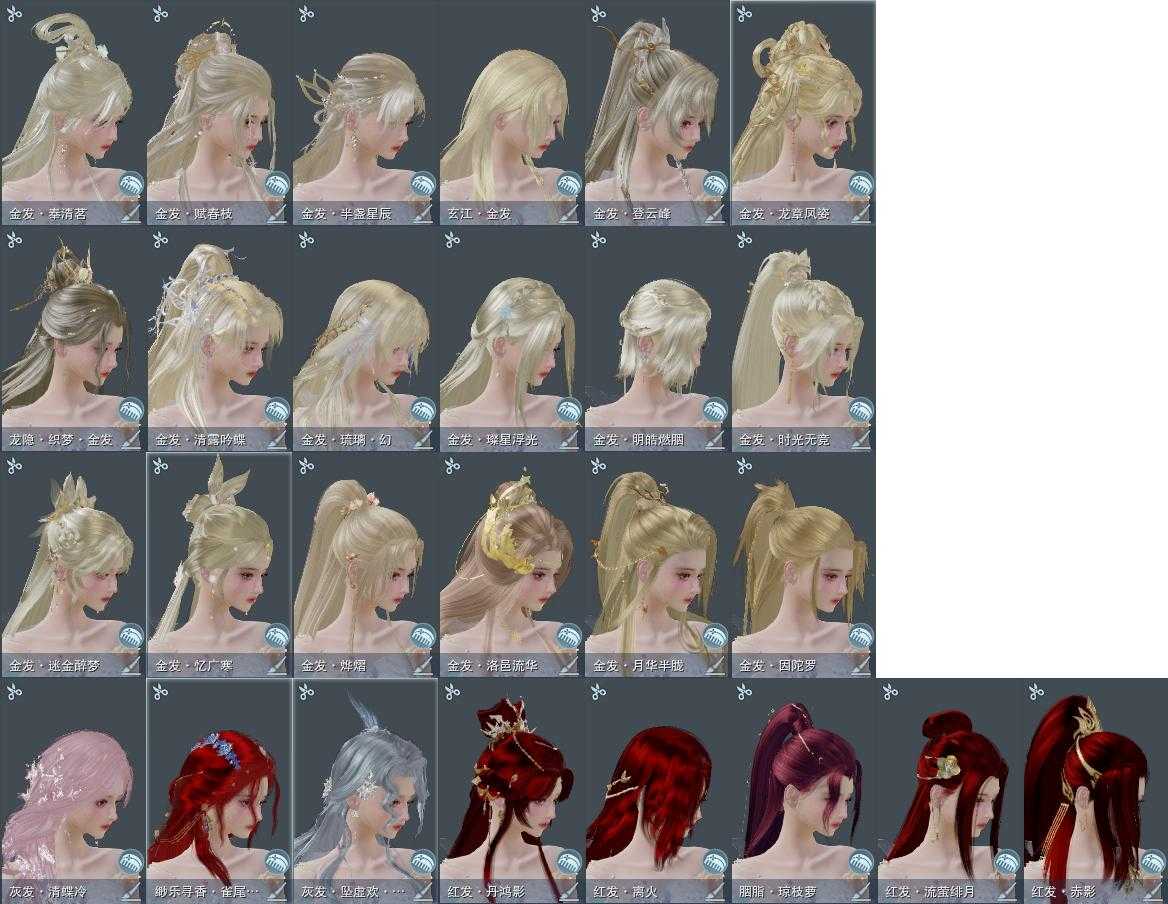 【发型】金发21个[猴金, 兔金, 资历金, 鸡金, 玫瑰金, 猪金, 如归金, 时光金, 牛金, 云金, 双十二金发, 雪金, 海金, 水母金, 龙金, 三代金, 玄江金发, 精灵金, 蛇金, 金发奉清茗, 白龙隐金发], 红发8个[五红, 紫发, 蝶粉, 虎红, 小资历红, 大资历红, 蓝寻香红发, 三代灰银], 黑发46个, 白发29个, 盒子发型[踏云黑发, 二代元宵白, 晴岚绘黑发, 踏云白发, 五代七夕黑发, 晴岚绘白发, 五代七夕白发, 晚日黑发, 沧海黑发, 沧海白发, 六代中秋黑发, 六代中秋白发, 红懒猪黑发, 红梅盒黑发, 紫人间黑发, 红梅盒白发, 白幽昙黑发, 幽涧愀兮白发, 黑椿山黑发, 灵龙盒黑发, 蓝沧洲盒黑发, 黑沧洲盒黑发, 西游盒黑发, 白持君盒黑发, 灵龙白发, 八七盒黑发, 白八中黑发, 西游盒白发, 八七盒白发, 游龙盒黑发, 婚纱盒黑发, 粉鹿黑发, 游龙盒白发, 婚纱盒白发, 蓝鹭黑发, 梦盒黑发, 九七黑发, 白蛇盒黑发, 梦盒白发, 绿千山黑发, 九七白发, 白蛇盒白发, 紫陇西黑发, 墨龙盒黑发, 蓝寻香黑发, 红蝴蝶黑发, 墨龙盒白发, 潮涌盒黑发, 红蝴蝶白发, 瓷盒黑发, 潮涌盒白发, 瓷盒白发, 粉毛衣黑发], 总页数11
