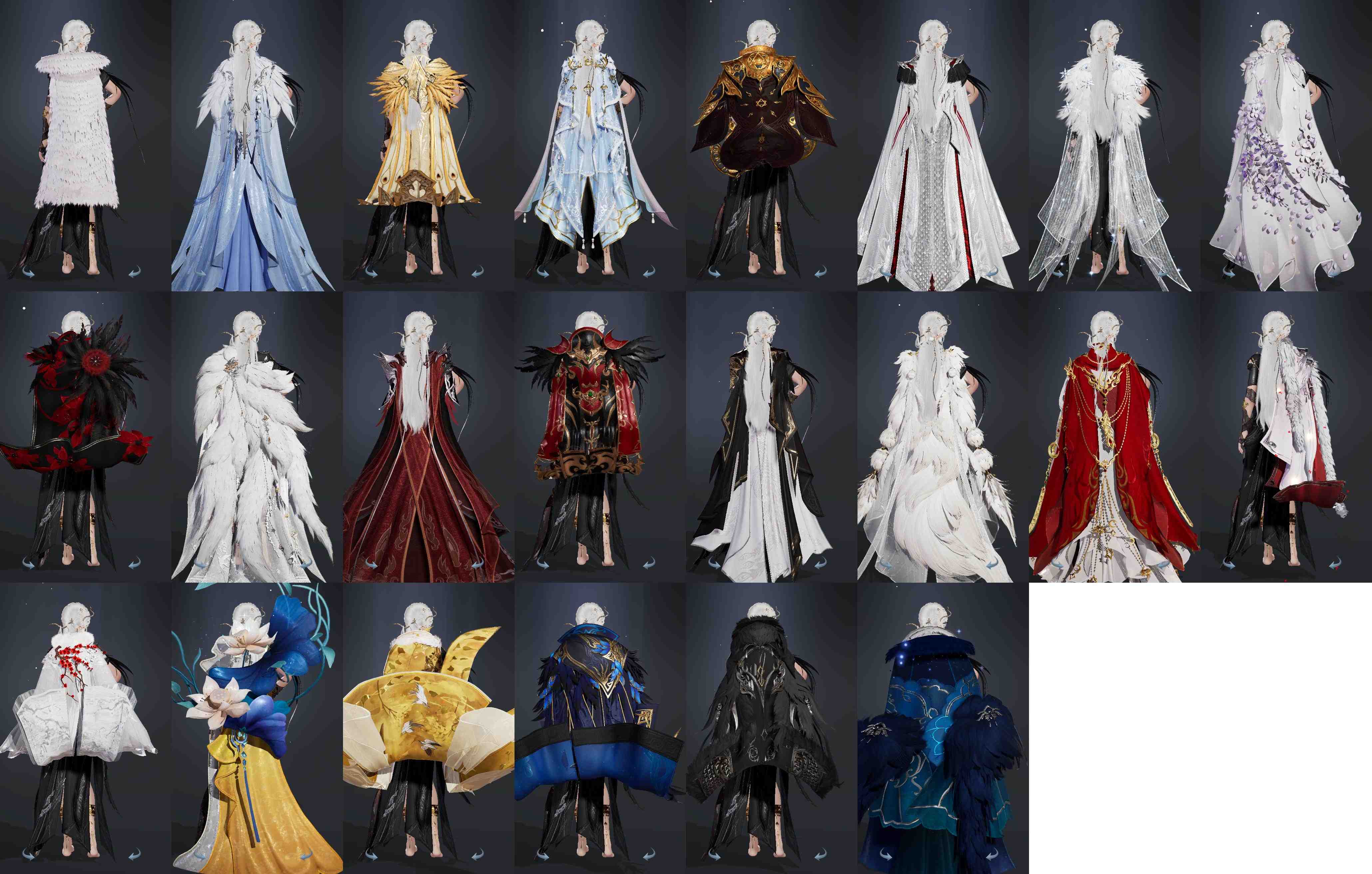 复刻:[白白菜, 银罗姆, 黑贺华岁, 罗姆弦月, 天河枕星, 复刻白二娃, 粉蓝机车, 天选黄无色, 复刻蓝不欺, 夜斩白孤云, 夜斩白暮长, 沧海间烟暮, 五期福袋成衣, 花非花苍黛, 折花留芳坠绯]