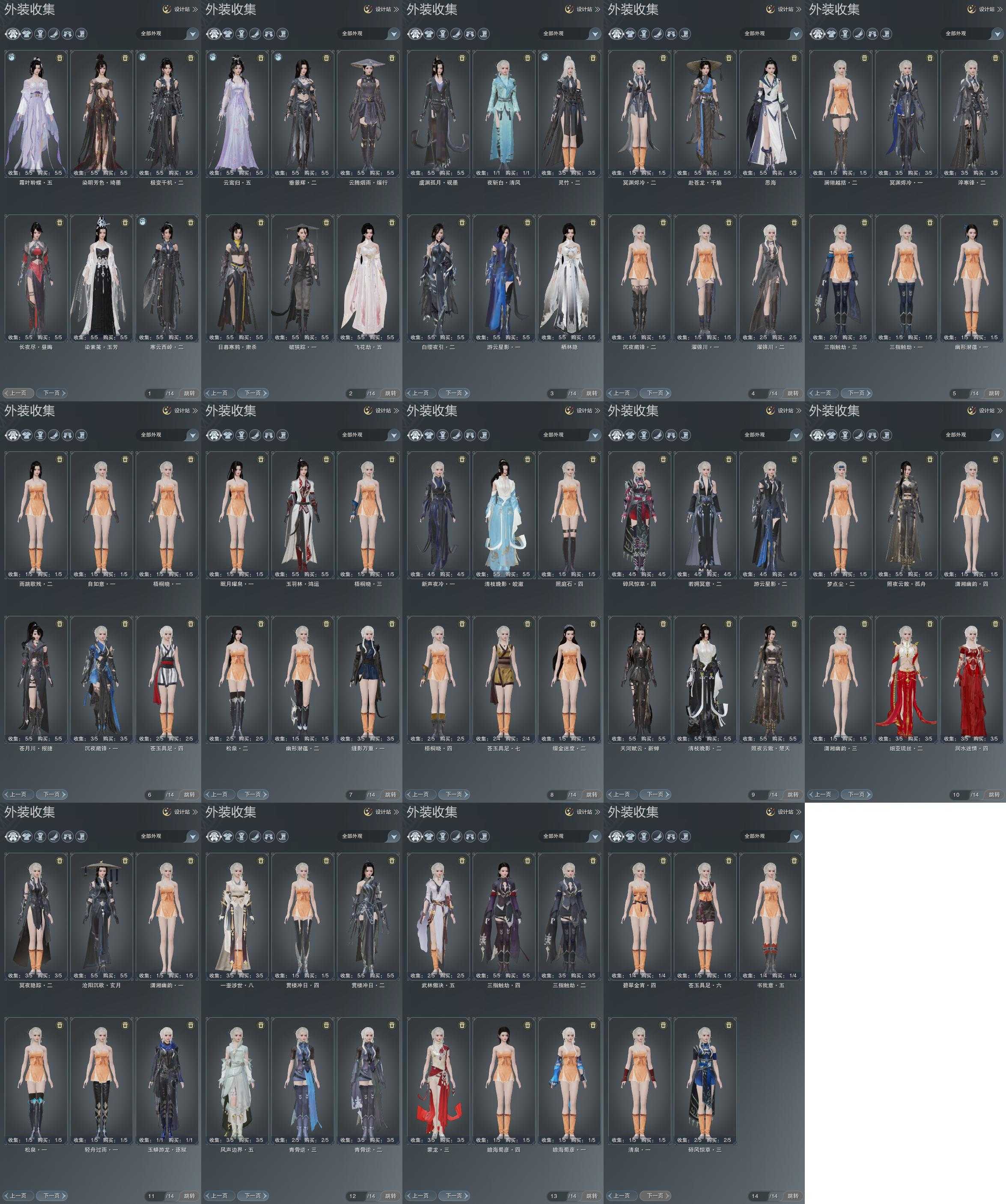 限时限量:[海韵小调, 月寒凌苍, 平岸春溪, 十三万资历衣, 金浮琅玉, 瀚漠民服, 牧原胡装, 烟花套, 黑枕戈, 十二周年工作服, 玉悬窗烟霭, 客行逍遥夜影, 一期福袋成衣, 十三周年成衣, 粉水母, 天河对影云砂, 万川青绿黛瑾, 蓝浪海, 十四周年工作服, 云闲归鹤, 紫游仙]