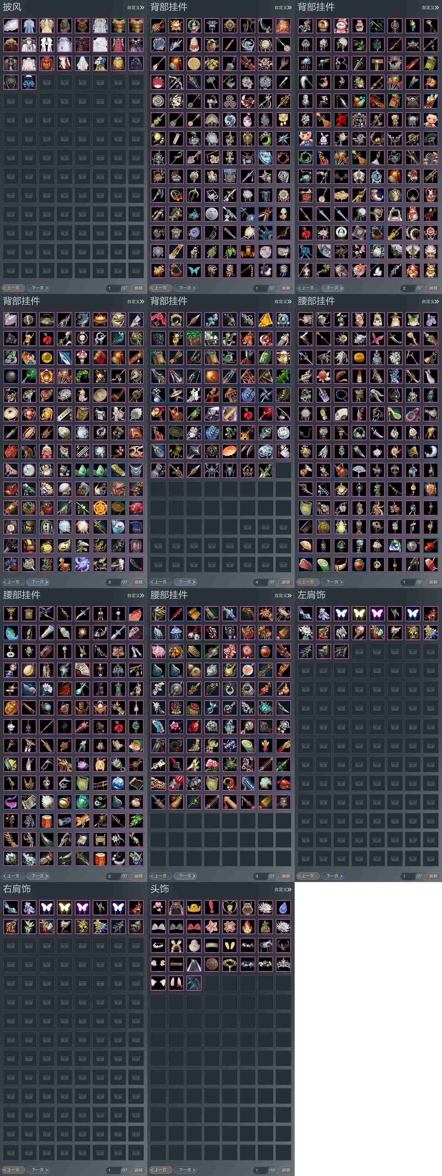 【肩饰】19左,16右,[双鱼曳波·极乐·左, 觅花踪·碧空·左, 觅花踪·黄云·左, 觅花踪·碧空·左, 云旌望捷·左, 觅花踪·碧空·左, 霜落轻裘·左, 日月无心·左, 赤羽逍遥·左, 云中雪霁·左, 剑歌惊月·左, 天穹掠影·左, 九阙天影·左][觅花踪·碧空·右, 觅花踪·黄云·右, 觅花踪·碧空·右, 云旌望捷·右, 觅花踪·碧空·右, 霜落轻裘·右, 日月无心·右, 云中雪霁·右, 剑歌惊月·右, 天穹掠影·右, 九阙天影·右]
