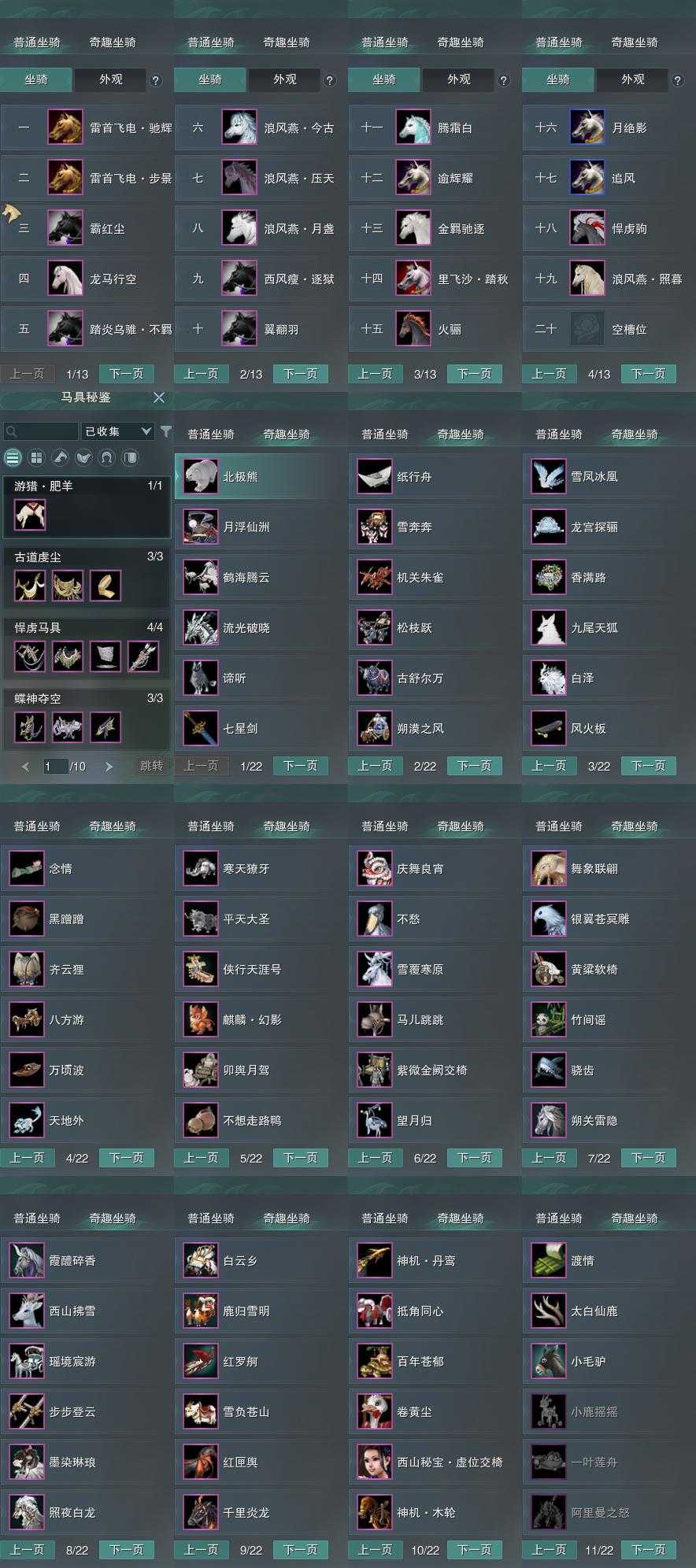 【坐骑】19个[踏炎不羁, 西风瘦逐狱, 里飞沙踏秋, 金羁驰逐, 白龙马, 浪风燕今古, 霸红尘, 雷首飞电步景, 雷首飞电驰辉]