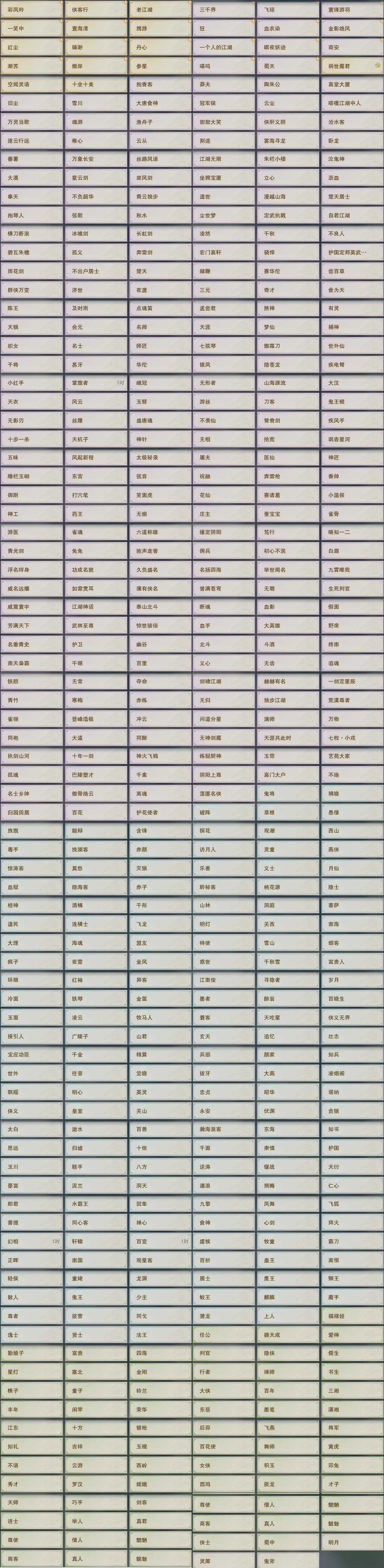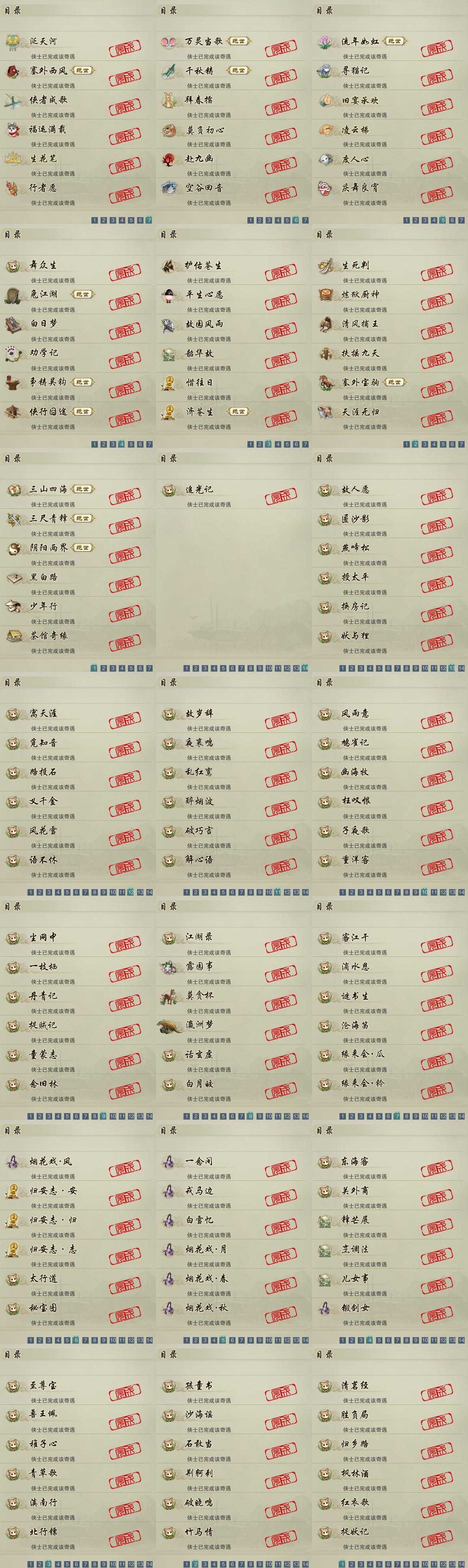 【奇遇】41个[白日梦, 天涯无归, 三山四海, 劝学记, 阴阳两界, 莫负初心, 兔江湖, 平生心愿, 黑白路, 惜往日, 塞外宝驹, 争铸吴钩, 韶华故, 护佑苍生, 济苍生, 少年行, 故园风雨, 扶摇九天, 三尺青锋, 流年如虹, 舞众生, 清风捕王, 寻猫记, 侠行囧途, 茶馆奇缘, 万灵当歌, 庆舞良宵, 生死判, 千秋铸, 凌云梯]