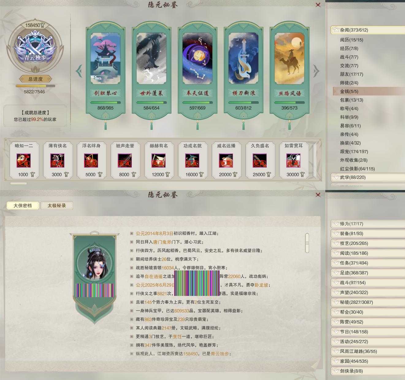 【同伴】沐晴柔89级境界壹,康宴别88级境界壹,月嘉禾87级境界壹,贺闲意86级境界壹,沈剑心85级境界壹,卫庄意85级境界壹,唐小珂84级境界壹,阮闲舟84级境界壹,李星云84级境界壹,白鹊84级境界壹,盖聂84级境界壹,赵灵儿84级境界壹,李逍遥81级境界壹,姜棠志79级境界壹,阮归云77级境界壹,茸茸志72级境界壹,温辞秋70级境界壹,燕子娘68级境界壹,温折枝67级境界壹,刀马志67级境界壹,年小鹿65级境界壹,年小熊61级境界壹,费大劲60级境界壹,李萼志1级境界壹