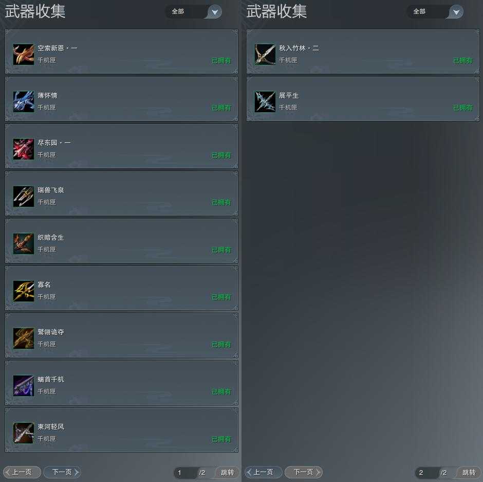 【拓印】14页外观收集,11武器拓印,拓印100CW鹫翎诡夺,拓印100CW螭首千机,拓印110CW柬河轻风