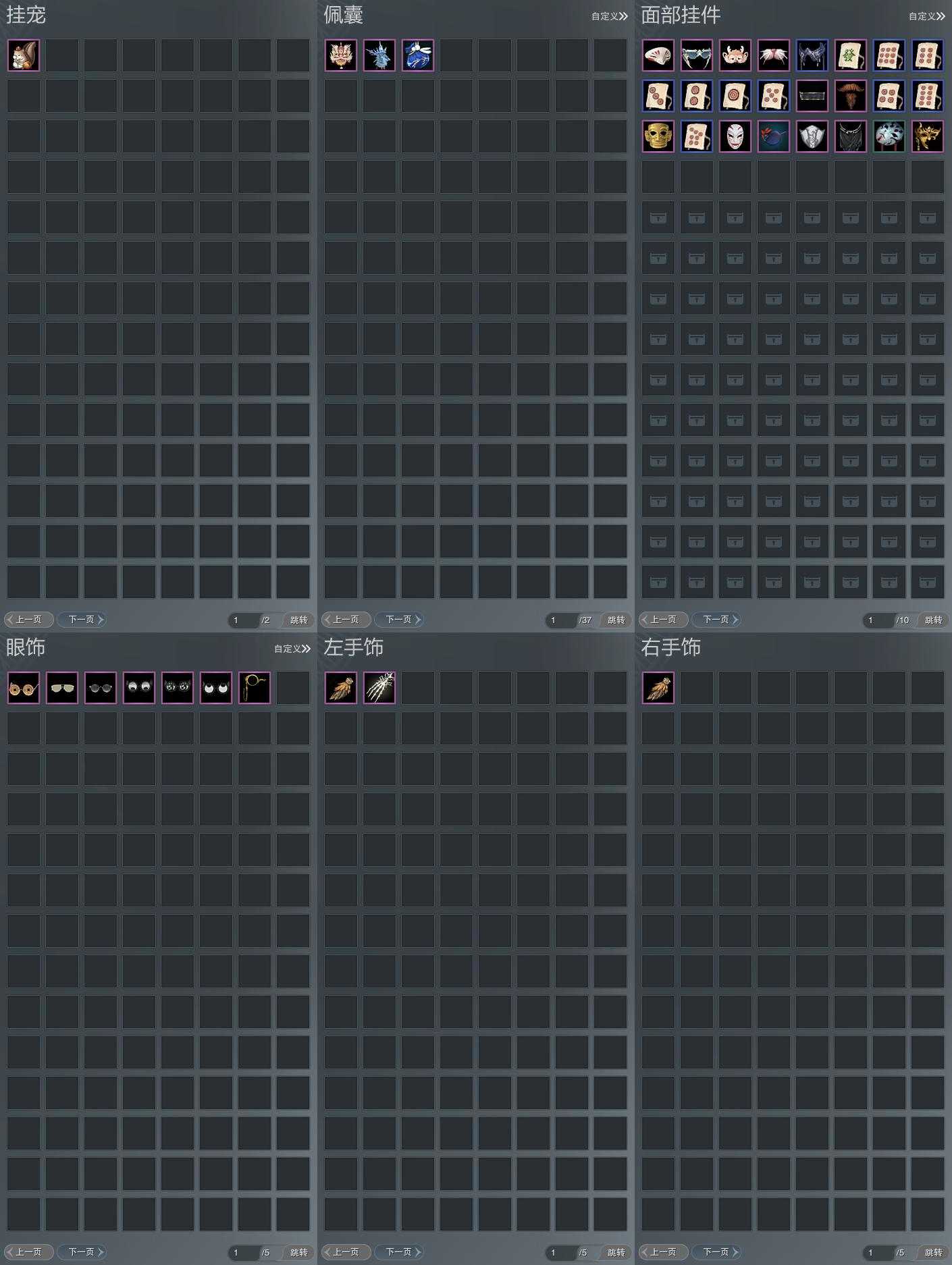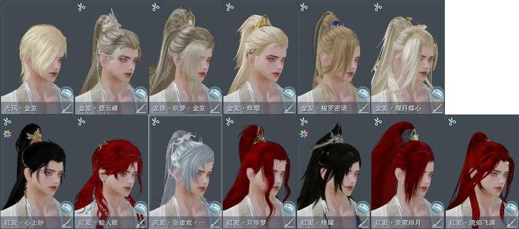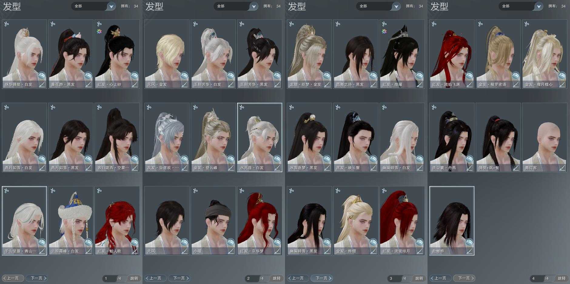 【发型】金发6个[狐金, 资历金, 猪金, 三代金, 无风金发, 白龙隐金发], 红发7个[九红, 兔红, 小资历红, 龙红, 十五红, 蛇红, 三代灰银], 黑发15个, 白发7个, 盒子发型[幽阑黑发, 幽阑白发, 花滑黑发, 圆舞盒黑发, 白幽馥黑发, 彩陇西黑发, 燕月盒黑发, 绿千山白发, 云掠霜峰白发, 燕月盒白发, 重花游黑发], 总页数4