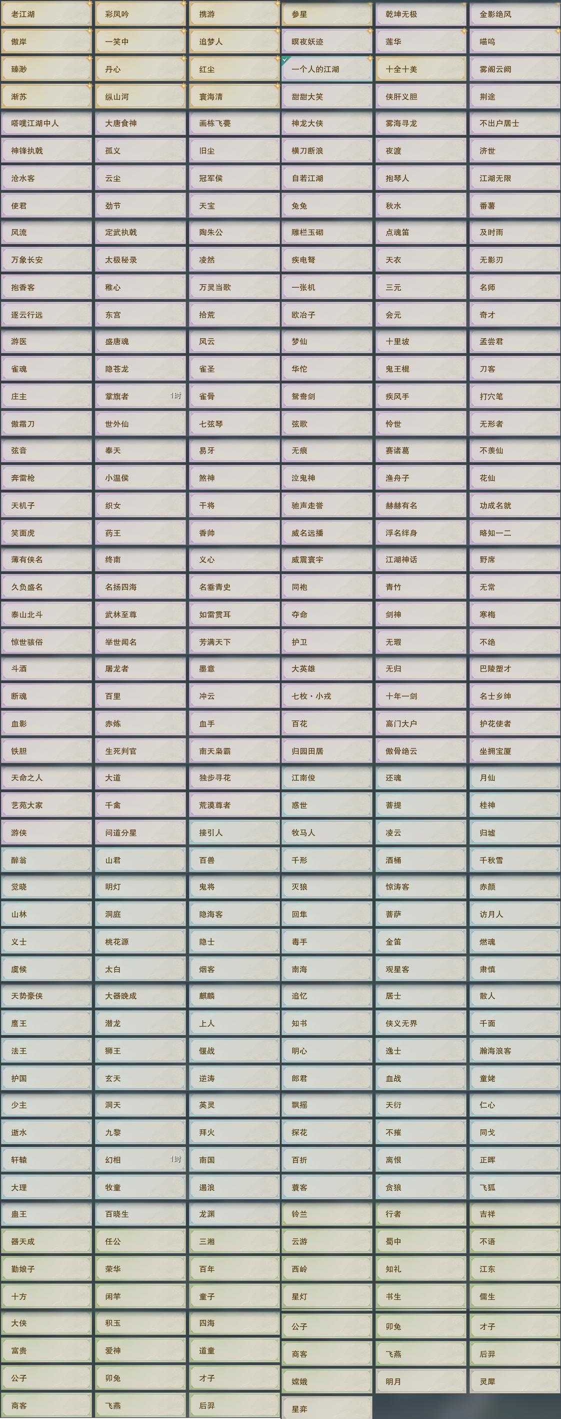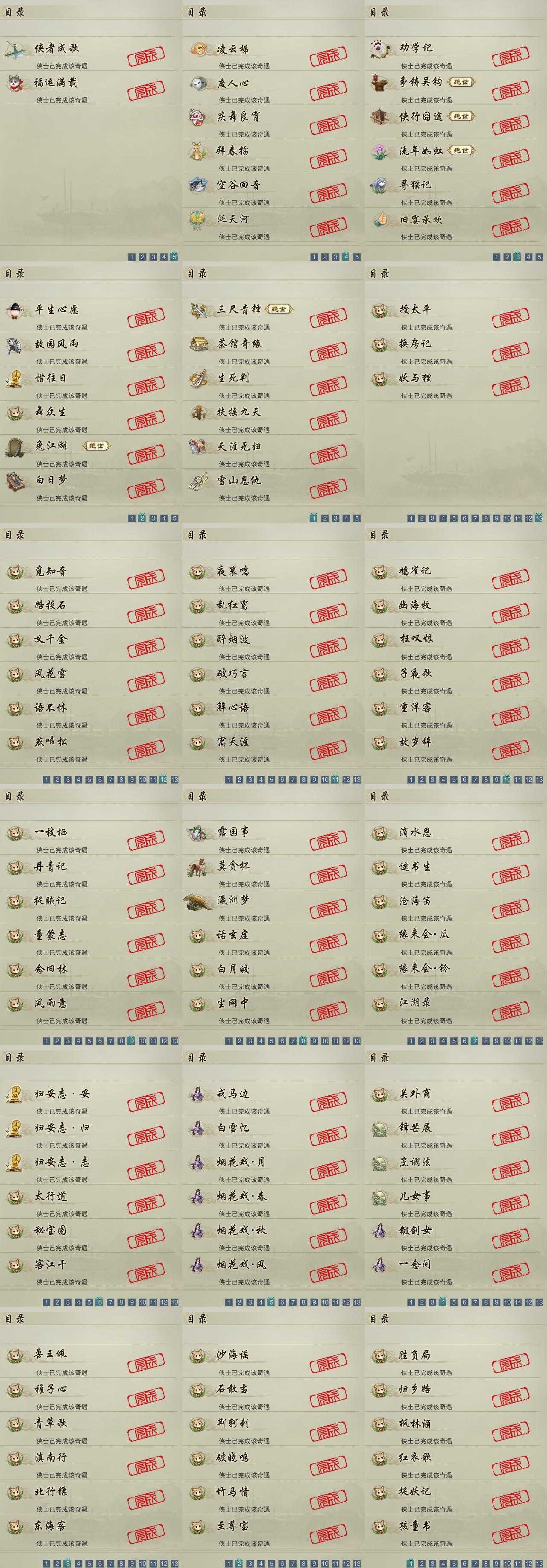 【奇遇】26个[白日梦, 天涯无归, 劝学记, 雪山恩仇, 平生心愿, 兔江湖, 惜往日, 争铸吴钩, 故园风雨, 三尺青锋, 扶摇九天, 流年如虹, 舞众生, 侠行囧途, 寻猫记, 茶馆奇缘, 庆舞良宵, 生死判, 凌云梯, 度人心, 空谷回音, 旧宴承欢, 泛天河, 侠者成歌, 拜春擂, 福运满载]