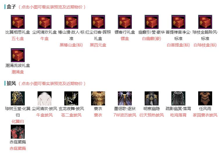 单盒成衣:[唐风韶颜衣, 黑狮盒衣, 小金龙衣, 蓝傣族衣, 卿酒盒衣, 蓝问刀]