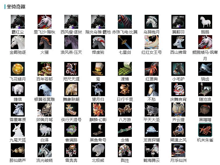 【坐骑】8个[踏炎霸地, 赤珠比翼, 西风瘦逐狱, 乌蹄抱月, 里飞沙踏秋, 金羁驰逐, 鹏鹏, 霸红尘]