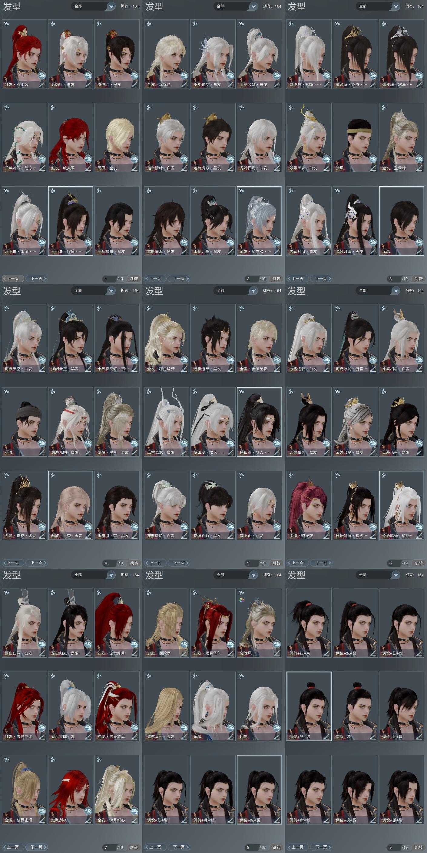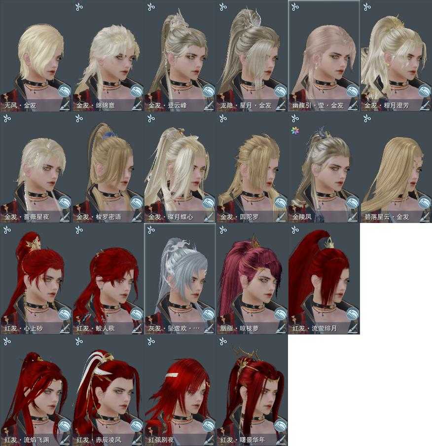 【发型】金发12个[一代金, 狐金, 猴金, 资历金, 苏金, 蔷薇金, 穆金, 三代金, 咩金, 无风金发, 白幽馥金发, 紫龙隐金发], 红发9个[八红, 九红, 紫发, 猴红, 鸡红, 小资历红, 十五红, 蛇红, 三代灰银], 黑发24个, 白发24个, 盒子发型[二代花朝黑, 雪月白发, 白楼兰黑发, 二代花朝白, 飞皇黑发, 五代七夕黑发, 白楼兰白发, 飞皇白发, 五代七夕白发, 蓝海岛黑发, 花滑白发, 黑椿山黑发, 踏青黑发, 黑椿山白发, 踏青白发, 西游盒黑发, 灵龙白发, 白幽馥黑发, 黑龙隐黑发, 蓝观灯盒黑发, 海阔盒黑发, 游龙盒白发, 茄盒黑发, 白鹭黑发, 黑鹭黑发, 龙吟盒黑发, 莲台盒黑发, 兰陵盒黑发, 海阔盒白发, 紫月下黑发, 茄盒白发, 妙乐盒白发, 白鹭白发, 镰刀黑发, 龙吟盒白发, 莲台盒白发, 梦盒白发, 黑月下白发, 青蛇盒白发, 镰刀白发], 总页数9