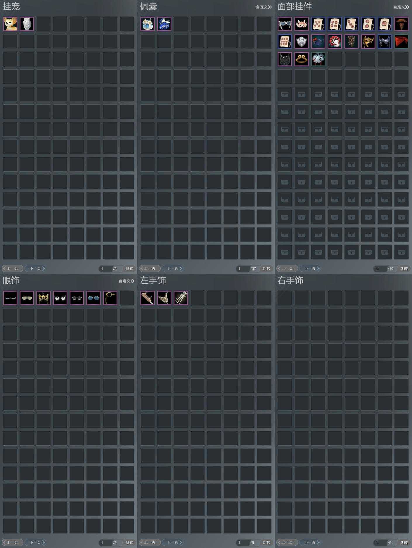 盒子:[雪月盒, 二代花朝盒, 红盒, 蘑菇盒, 五七盒, 白楼兰盒, 龙吟盒, 莲台盒, 踏青盒(缺背挂), 西游盒(缺白发), 黑椿山盒(豪), 黑龙隐(标), 海阔盒, 蓝观灯盒(标), 镰刀盒, 黑鹭笠盒(标), 白鹭盒(豪), 紫月下(标)]