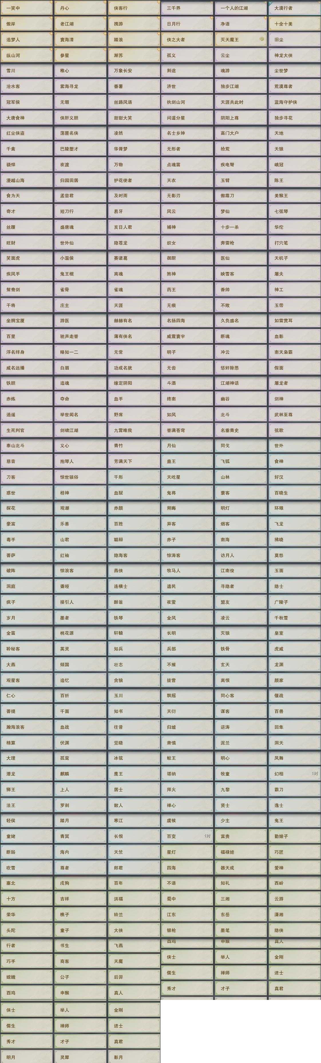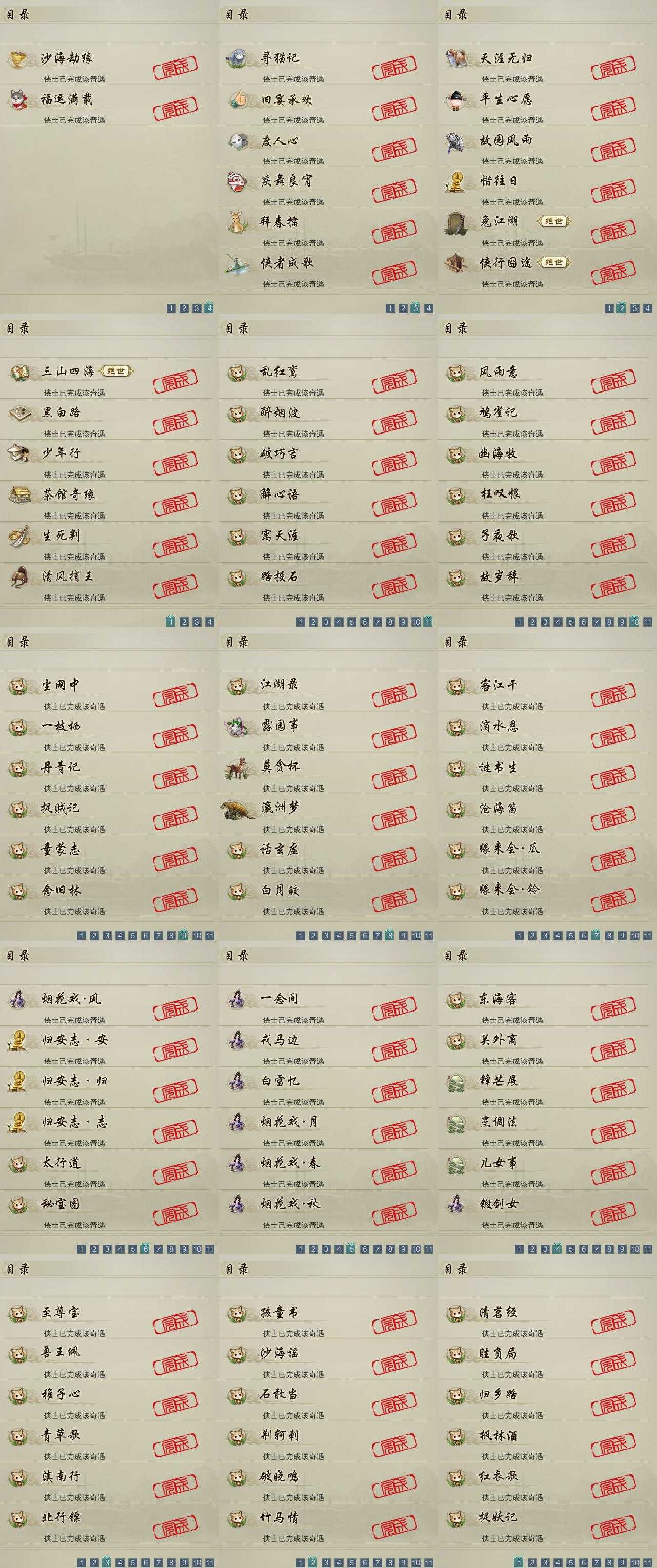 【奇遇】20个[天涯无归, 三山四海, 平生心愿, 兔江湖, 黑白路, 惜往日, 少年行, 故园风雨, 清风捕王, 寻猫记, 侠行囧途, 茶馆奇缘, 庆舞良宵, 生死判, 度人心, 旧宴承欢, 侠者成歌, 沙海劫缘, 拜春擂, 福运满载]