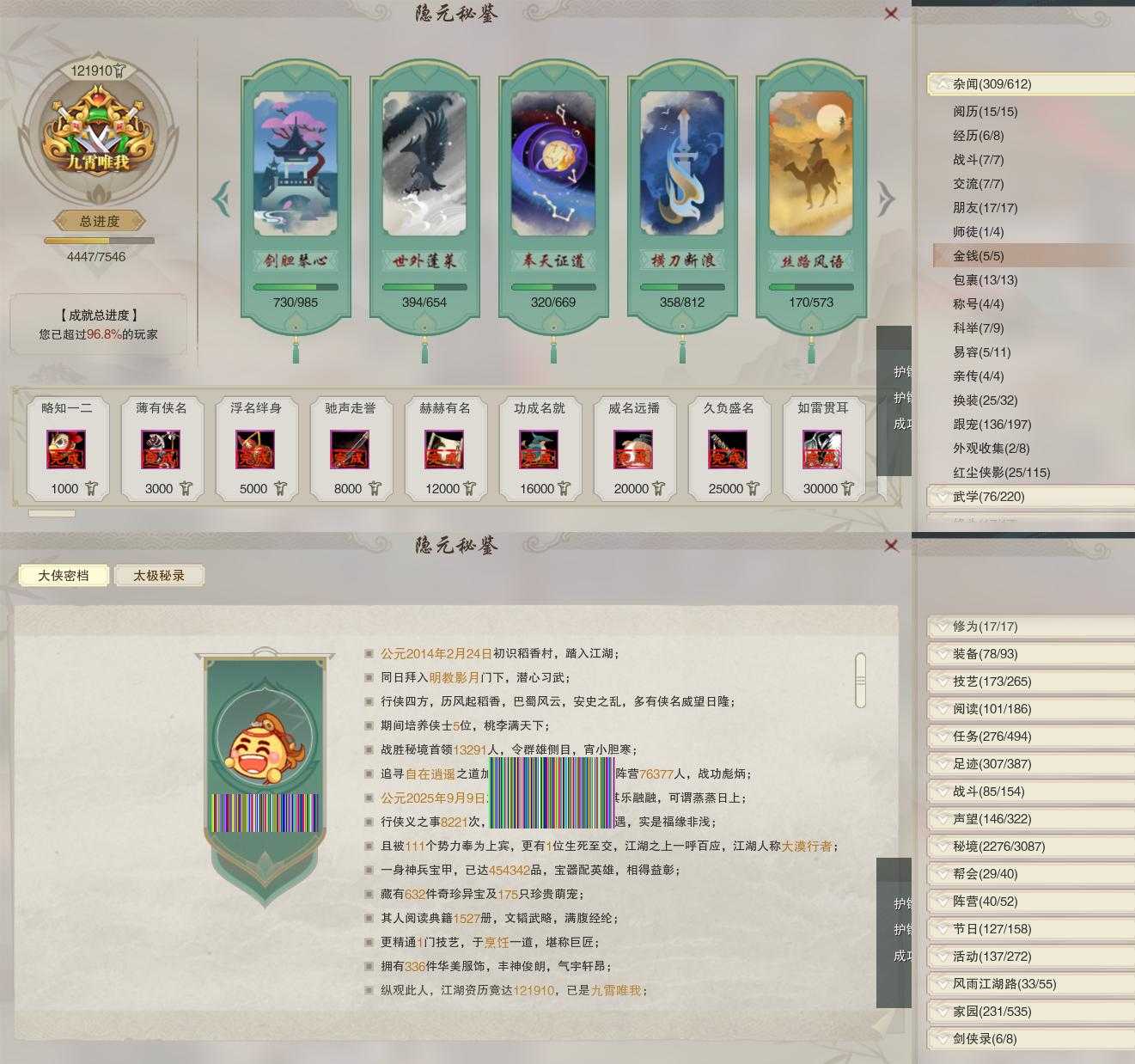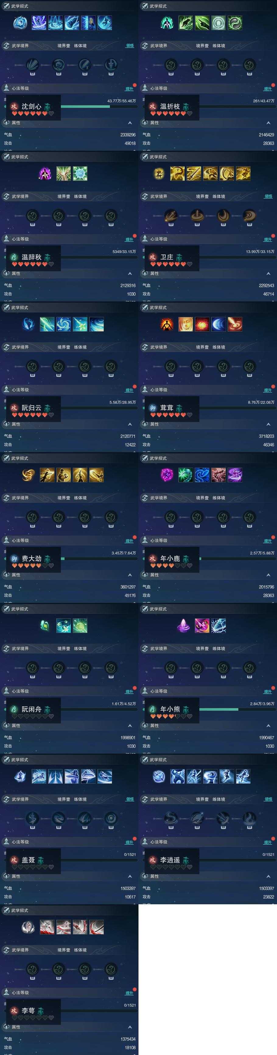 【同伴】沈剑心81级境界壹,温折枝78级境界壹,温辞秋76级境界壹,卫庄志76级境界壹,阮归云75级境界壹,茸茸志73级境界壹,费大劲65级境界壹,年小鹿63级境界壹,阮闲舟61级境界壹,年小熊60级境界壹,盖聂志1级境界壹,李逍遥1级境界壹,李萼志1级境界壹