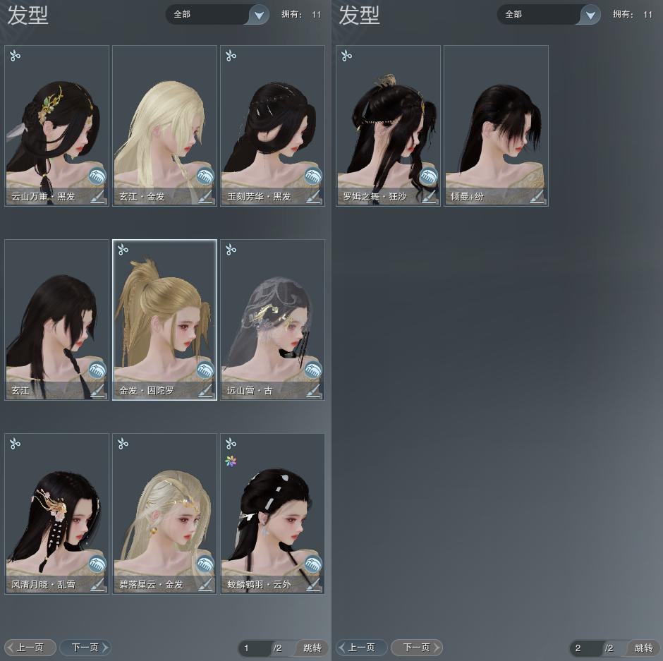 【发型】金发3个[猴金, 苏金, 玄江金发], 红发0个[], 黑发7个, 白发0个, 盒子发型[], 总页数2
