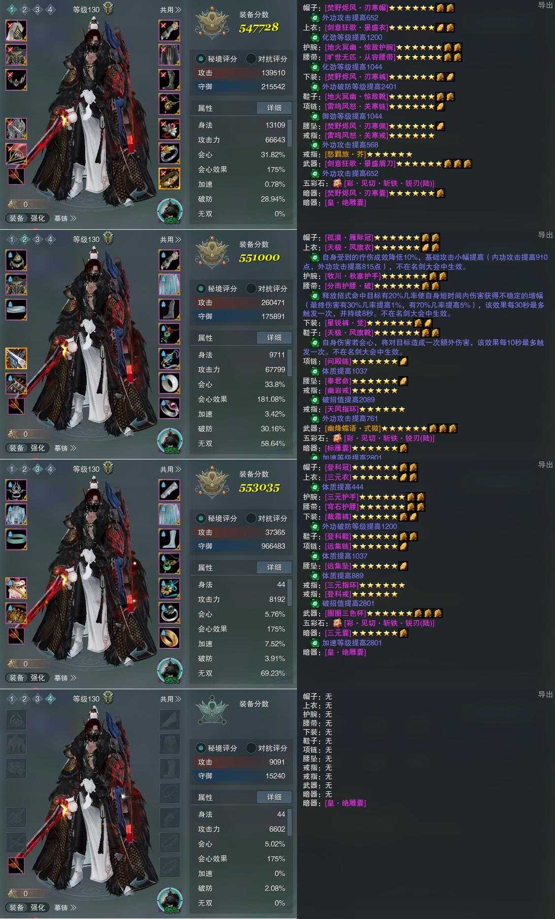 【装备】130级,分山劲PVP547728,分山劲PVE551000,铁骨衣PVE553035,装备四0