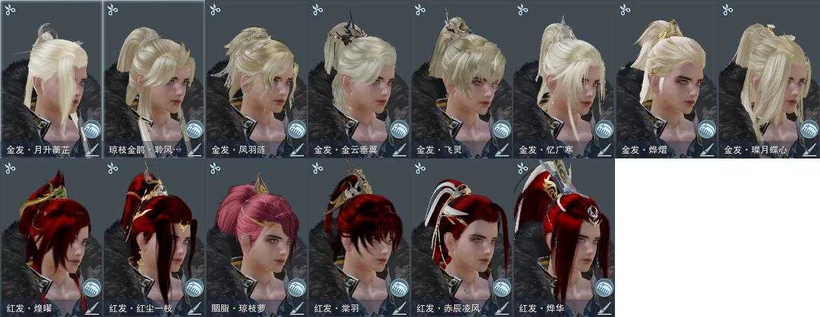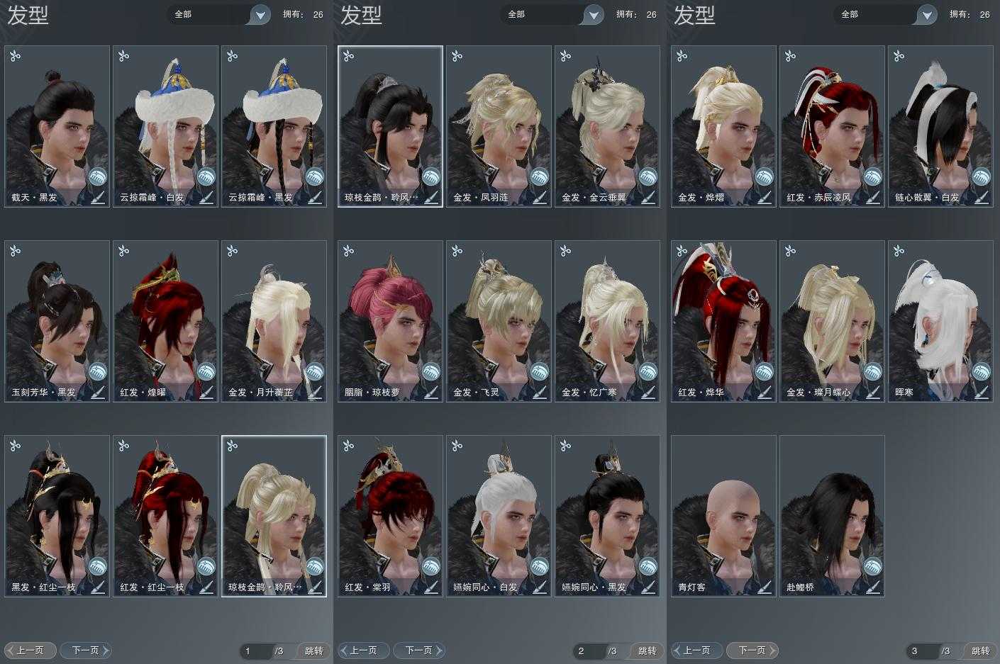 【发型】金发8个[狐金, 兔金, 猪金, 飒金, 苍金, 凤金, 香蕉金, 白琼枝金发], 红发6个[七红, 八红, 十红, 十二红, 紫发, 兔红], 黑发9个, 白发6个, 盒子发型[四代七夕黑发, 四代七夕白发, 白琼枝黑发, 十二黑, 云掠霜峰黑发, 云掠霜峰白发], 总页数3