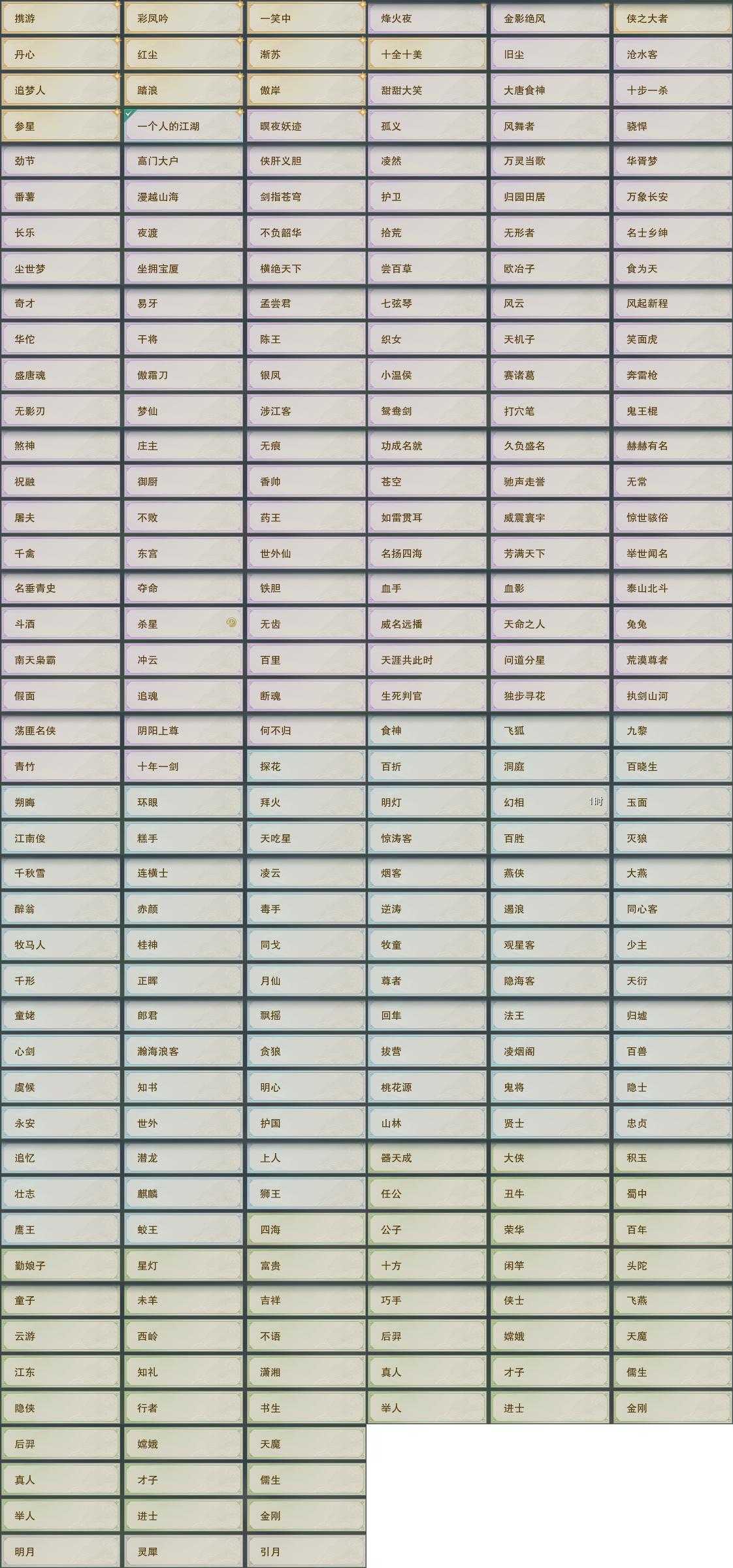 【奇遇】18个[天涯无归, 雪山恩仇, 平生心愿, 兔江湖, 争铸吴钩, 护佑苍生, 故园风雨, 扶摇九天, 寻猫记, 茶馆奇缘, 庆舞良宵, 生死判, 凌云梯, 度人心, 旧宴承欢, 泛天河, 拜春擂, 福运满载]