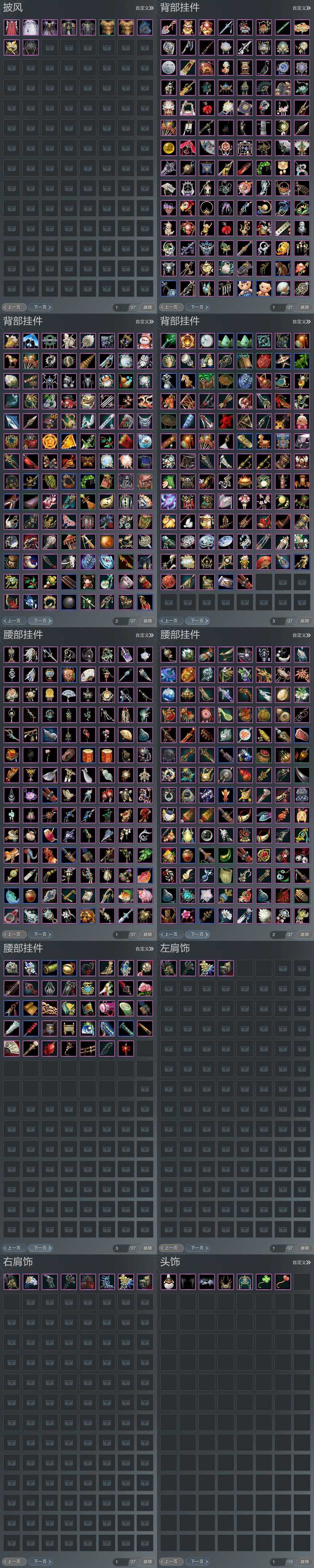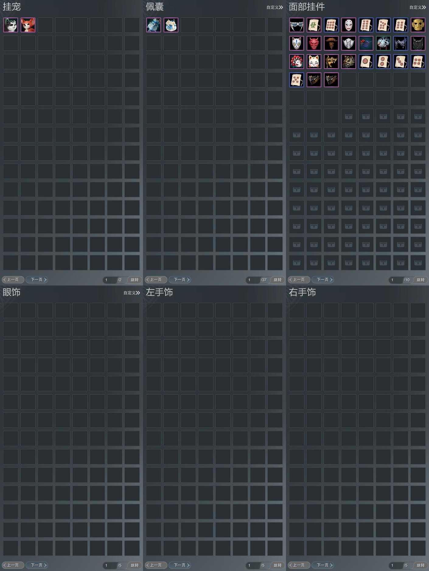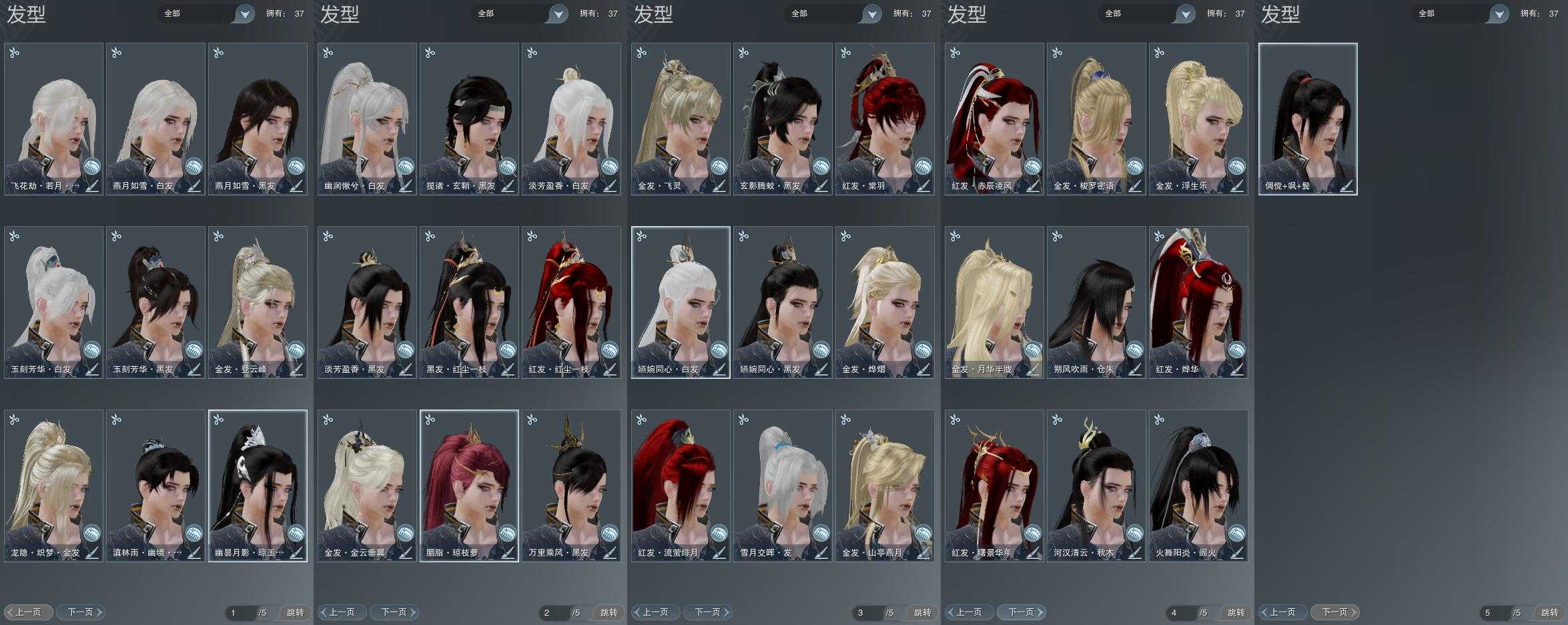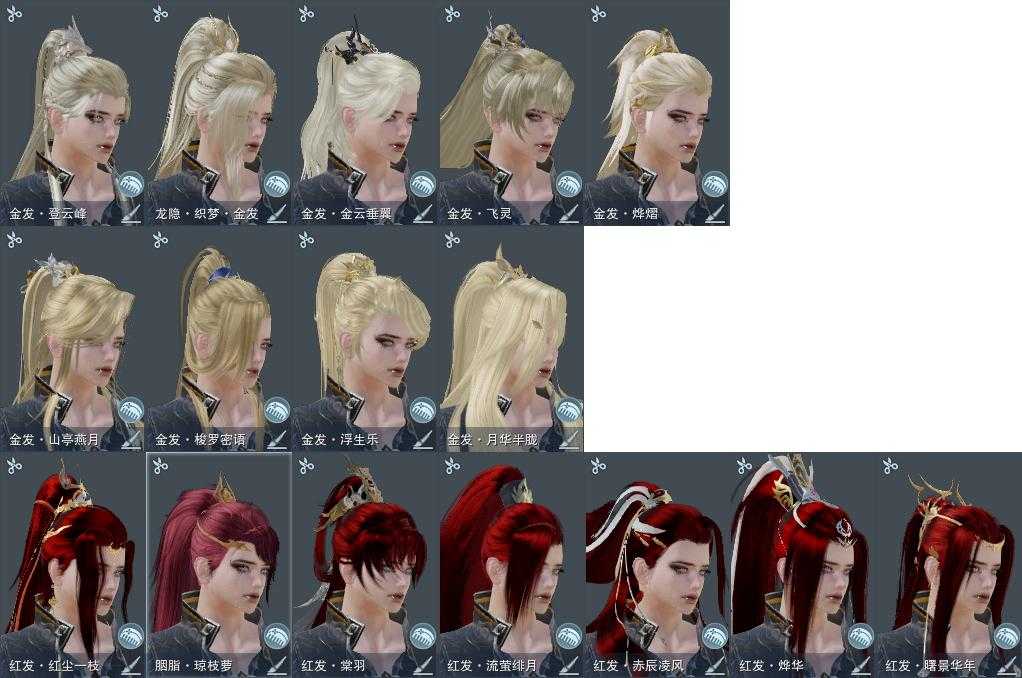 【发型】金发9个[资历金, 鸡金, 喵金, 国金, 猪金, 飒金, 苍金, 三代金, 白龙隐金发], 红发8个[七红, 八红, 十红, 十二红, 紫发, 猴红, 鸡红, 小资历红], 黑发13个, 白发7个, 盒子发型[四代七夕黑发, 小白龙黑发, 乘风黑发, 雪月白发, 四代七夕白发, 十二黑, 六代中秋黑发, 六代中秋白发, 黑懒猪黑发, 白幽昙黑发, 幽涧愀兮白发, 黑傣族黑发, 燕月盒黑发, 燕月盒白发], 总页数5