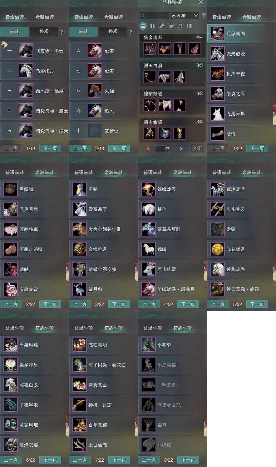 【坐骑】9个[踏炎横天, 踏炎腾云, 西风瘦逐狱, 飞霞骠黑云, 乌蹄抱月]