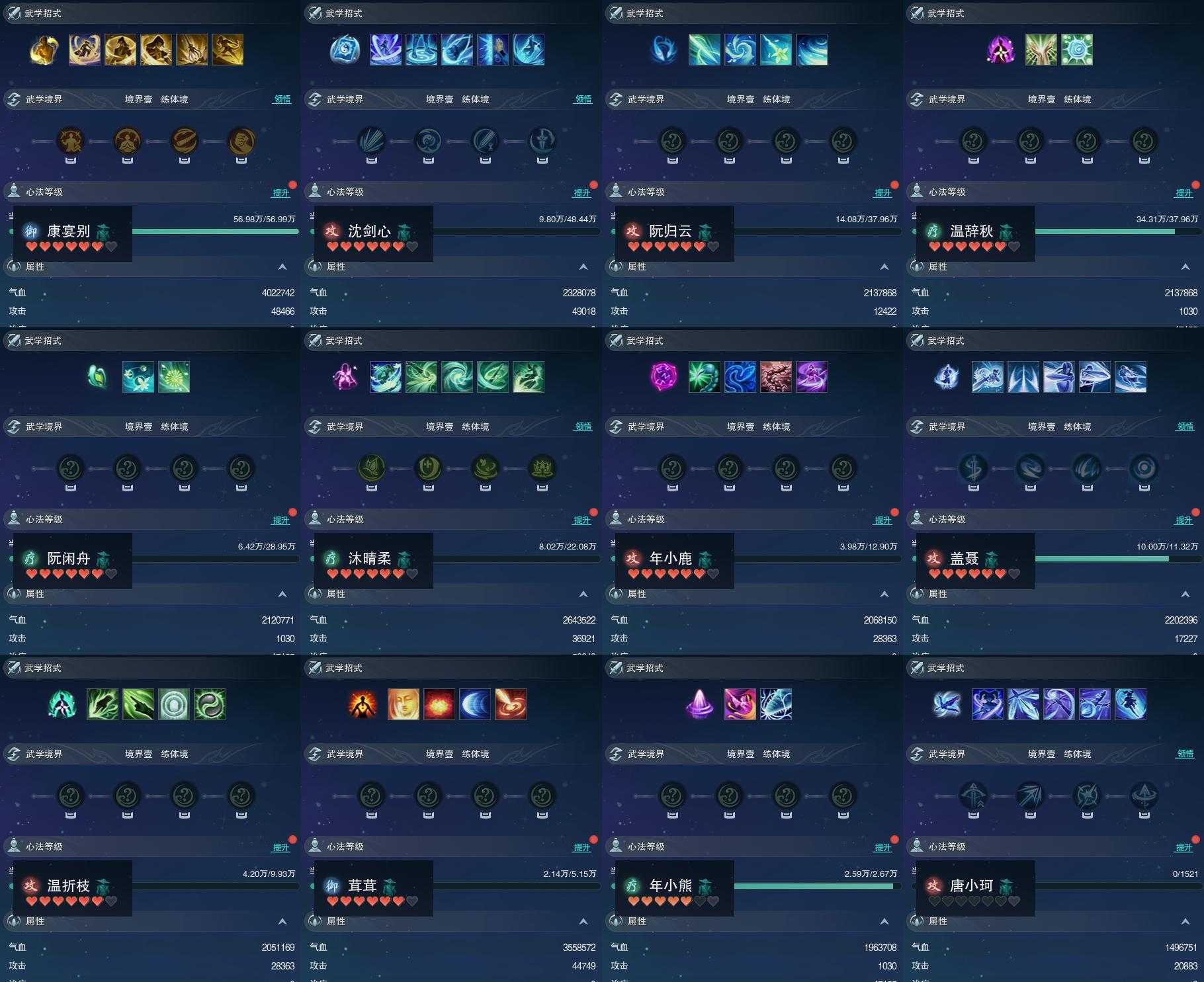 【同伴】康宴别80级境界壹,沈剑心80级境界壹,阮归云77级境界壹,温辞秋77级境界壹,阮闲舟75级境界壹,沐晴柔73级境界壹,年小鹿69级境界壹,盖聂志68级境界壹,温折枝67级境界壹,茸茸志62级境界壹,年小熊57级境界壹,唐小珂1级境界壹