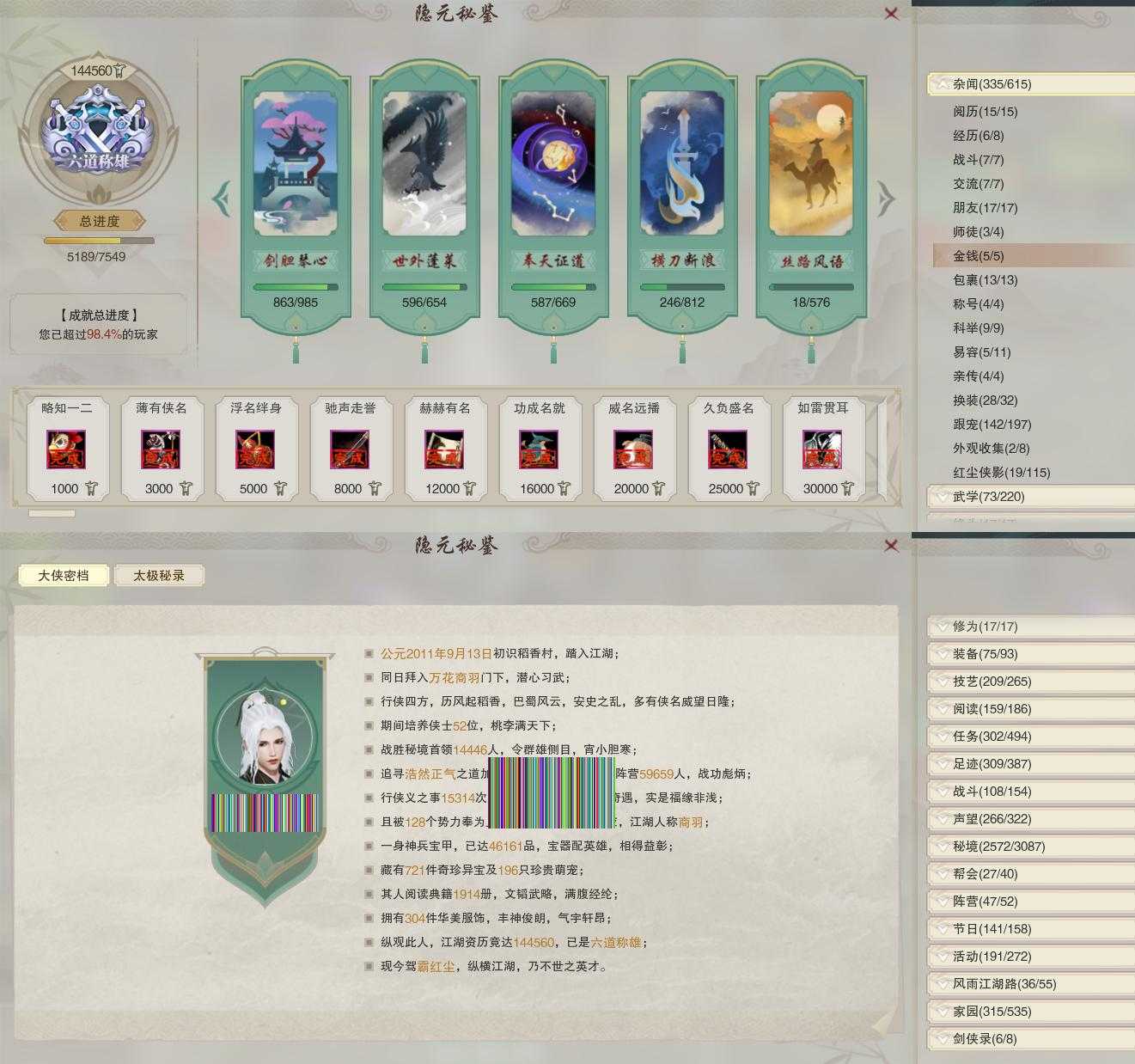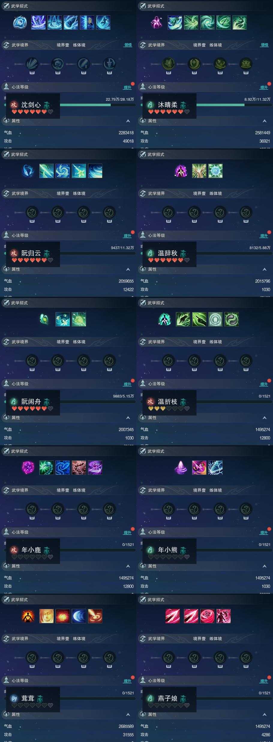 【同伴】沈剑心76级境界壹,沐晴柔68级境界壹,阮归云68级境界壹,温辞秋63级境界壹,阮闲舟62级境界壹,温折枝1级境界壹,年小鹿1级境界壹,年小熊1级境界壹,茸茸志1级境界壹,燕子娘1级境界壹
