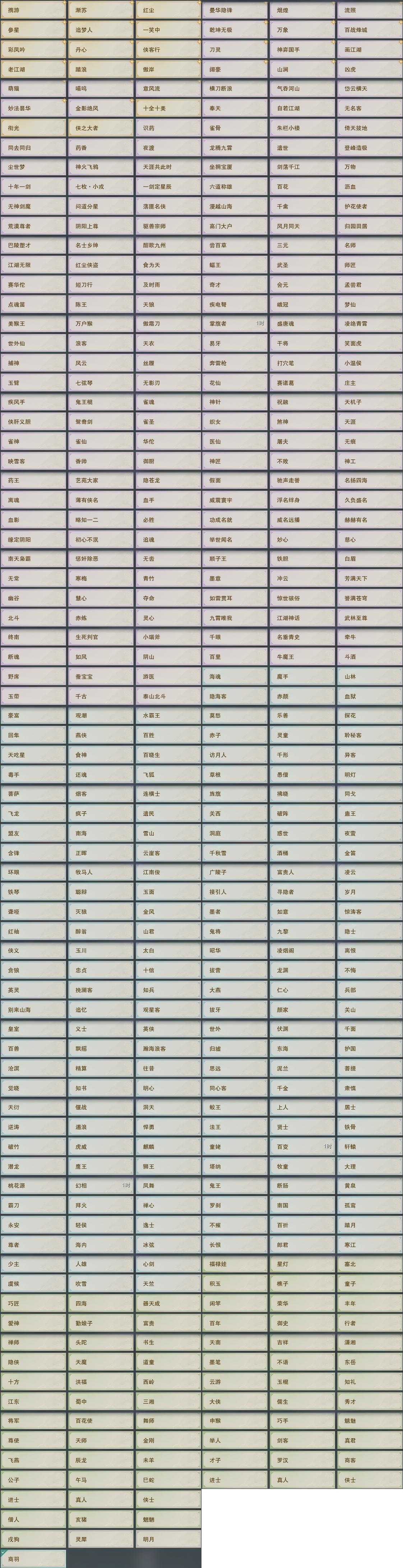 复刻:[黑潇湘, 沧海间缥缈, 彩云归素青, 复刻白二娃, 夜斩白孤云, 夜斩白暮长, 彩云归若霞, 榆塞吹角, 尽奏映妆, 尽奏怅舟, 一梦飘摇]